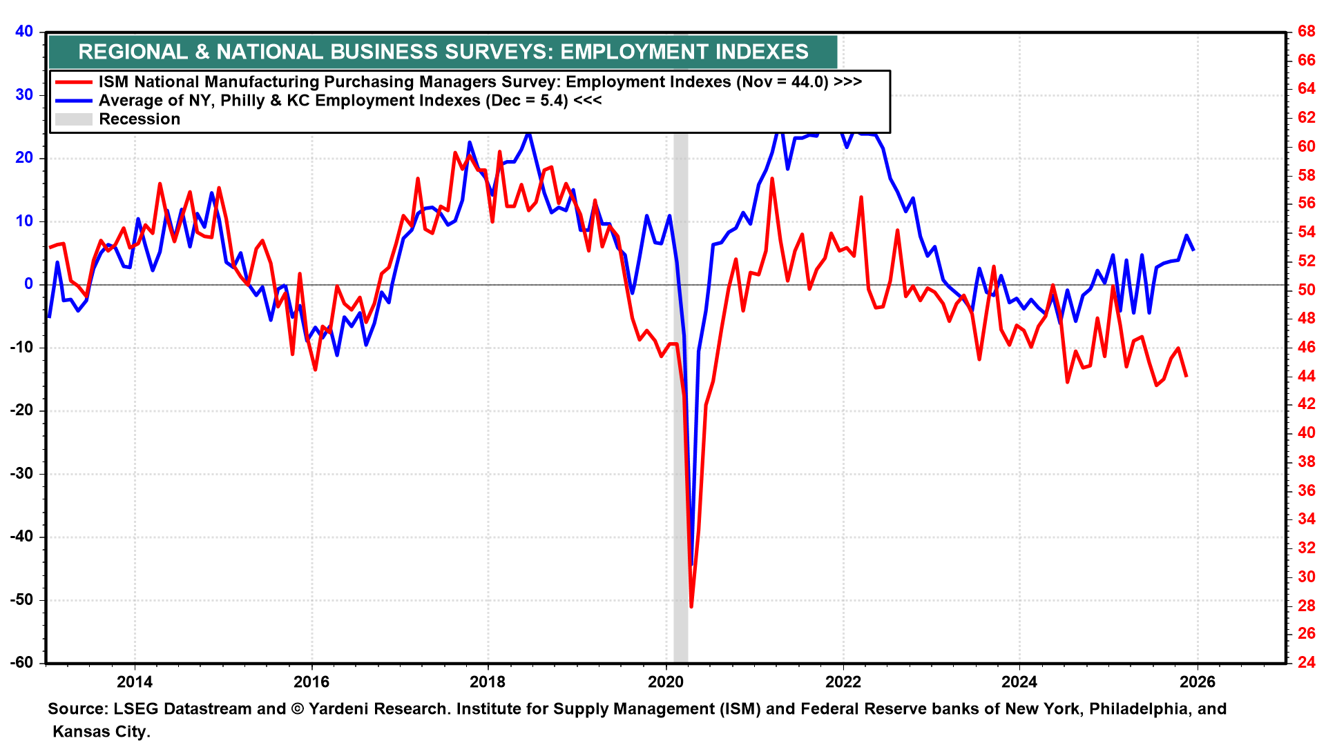 (4) Regional Fed surveys. The week opens with the Chicago Fed’s National Activity Index (Mon) for November. That's followed a day later by the Richmond Fed's business survey (Tue) for December. Though the regional Fed bank surveys have faced their own challenges as government data have gone quiet, this week's Richmond update may confirm the solid December employment reports from the NY, Philly, and Kansas City Feds (chart).