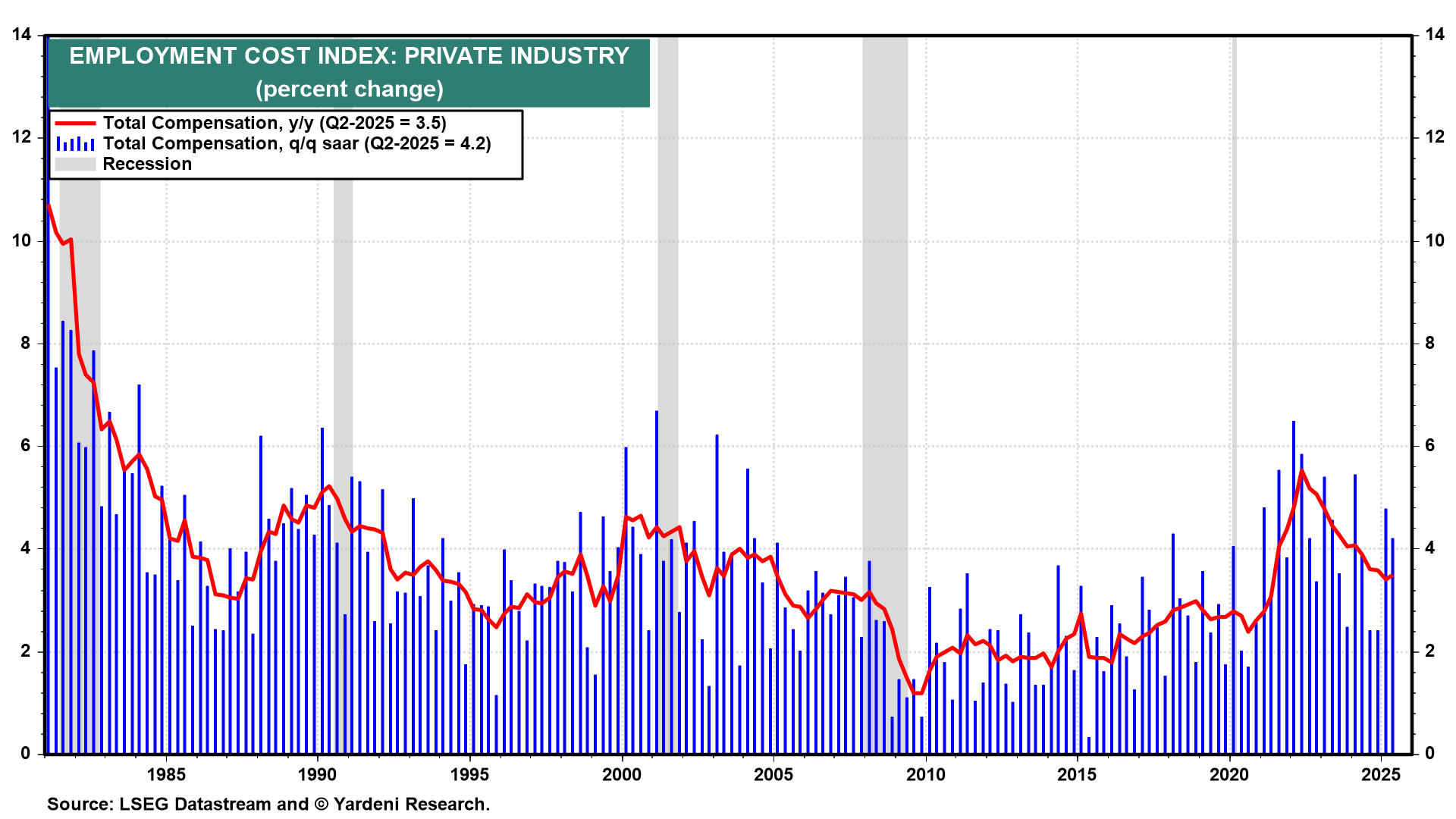 (2) Employment costs. Hitting the tape on Fed decision day, the Employment Cost Index (Wed) for Q3 could provide timely clues on wage dynamics. In Q1 and Q2, compensation rose by about 3.5% y/y (chart). Q3 might serve as a reminder from a wage perspective that US growth isn't as weak as many fear. Data on Q3 productivity and costs (Tue) should be robust as well.