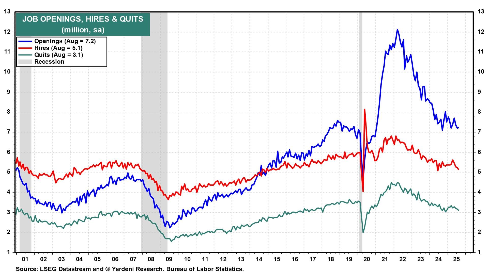 (1) JOLTS. As the data fog begins to lift, the October Job Openings and Labor Turnover Survey (Tue) will offer the markets a look at the latest labor market trends—especially hires, quits, and layoffs (chart). Though somewhat dated, any intel on how the economy opened Q4 will do. Initial claims (Thu) should also confirm that layoffs remain low.