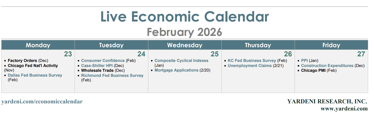 At home, the plot for Federal Reserve rate cuts has thickened, too. The minutes from the January Federal Open Market Committee meeting indicated that some officials think the next move could be to tighten. All this will increase attention on this week’s Fed members’ speaking engagements. Highlights include Governor Christopher Waller opining on the economic outlook (Mon) and tech disruption (Tue). Governor Lisa Cook tackles artificial intelligence and productivity (Tue).