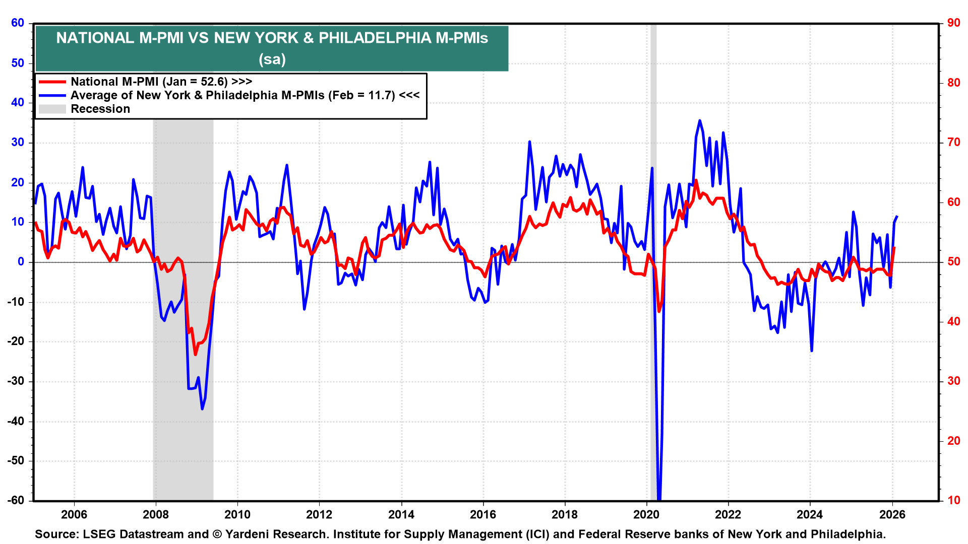 (3) Regional Fed surveys. As Fed Chair Jerome Powell and his fellow policymakers try to get a handle on growth dynamics, this week’s bevy of Fed business surveys could be illuminating. The Chicago Fed and Dallas Fed are out of the gate first (Mon), followed by the Richmond Fed (Tue) and Kansas City Fed (Thu). The New York and Philly surveys suggest business is improving (chart).