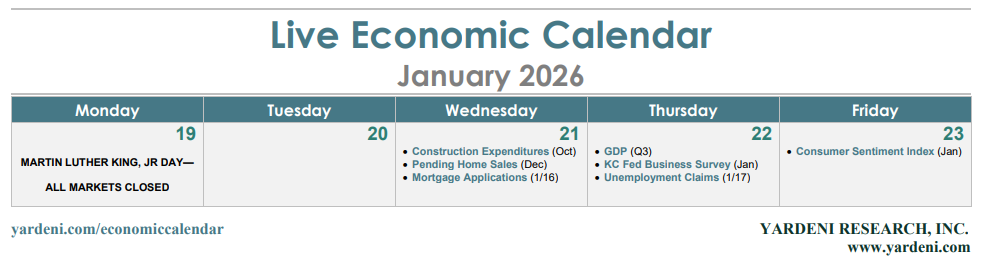 (1) GDP update. The balance of data suggests that the economy remained quite strong in the last three quarters of 2025. Even as employment slowed markedly, household demand confounded the skeptics, while capital spending on AI boomed. While a small revision up or down in Q3's real GDP (Thu) is possible, Q4's real GDP is tracking at a 5.3% gain (chart).