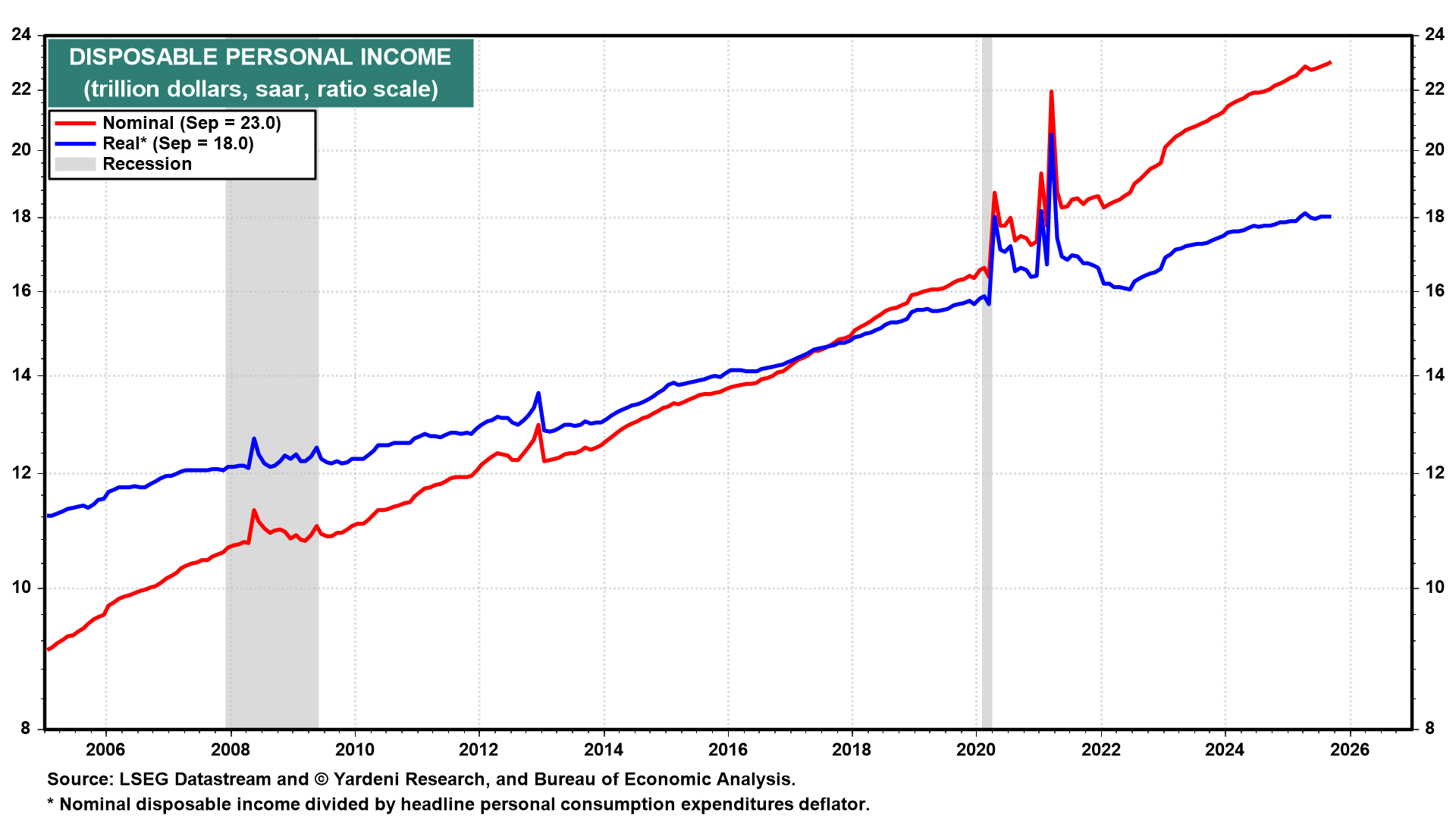 (2) Personal income, consumption, and saving. Personal income (Thu) for both October and November might confirm that real disposable income isn't growing much, if at all (chart). We would attribute that to retired Baby Boomers no longer earning labor income. Our thesis would be confirmed if consumer spending remains strong as the Baby Boomers dip into their retirement funds.