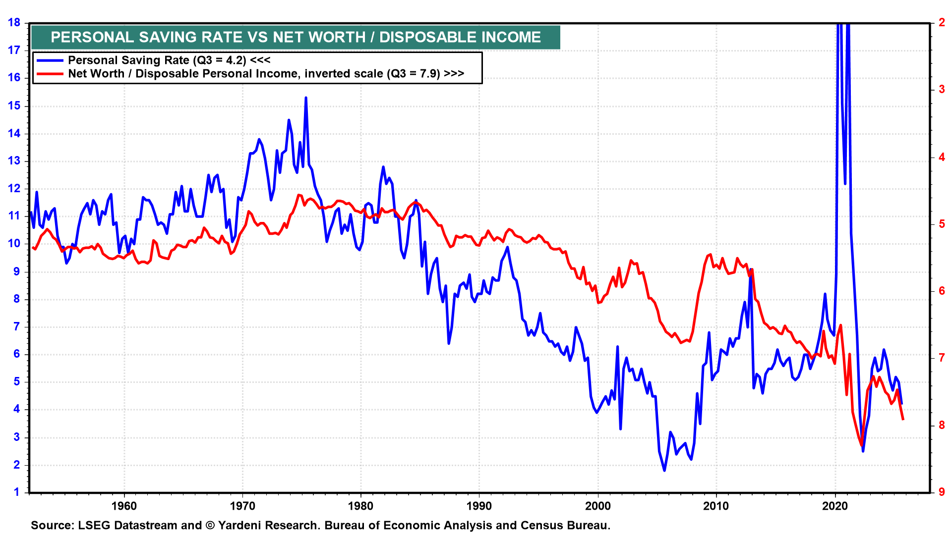 The personal saving rate (Thu) is likely to continue to fall in our narrative, especially if household net worth continues rising to new highs relative to disposable income (chart).