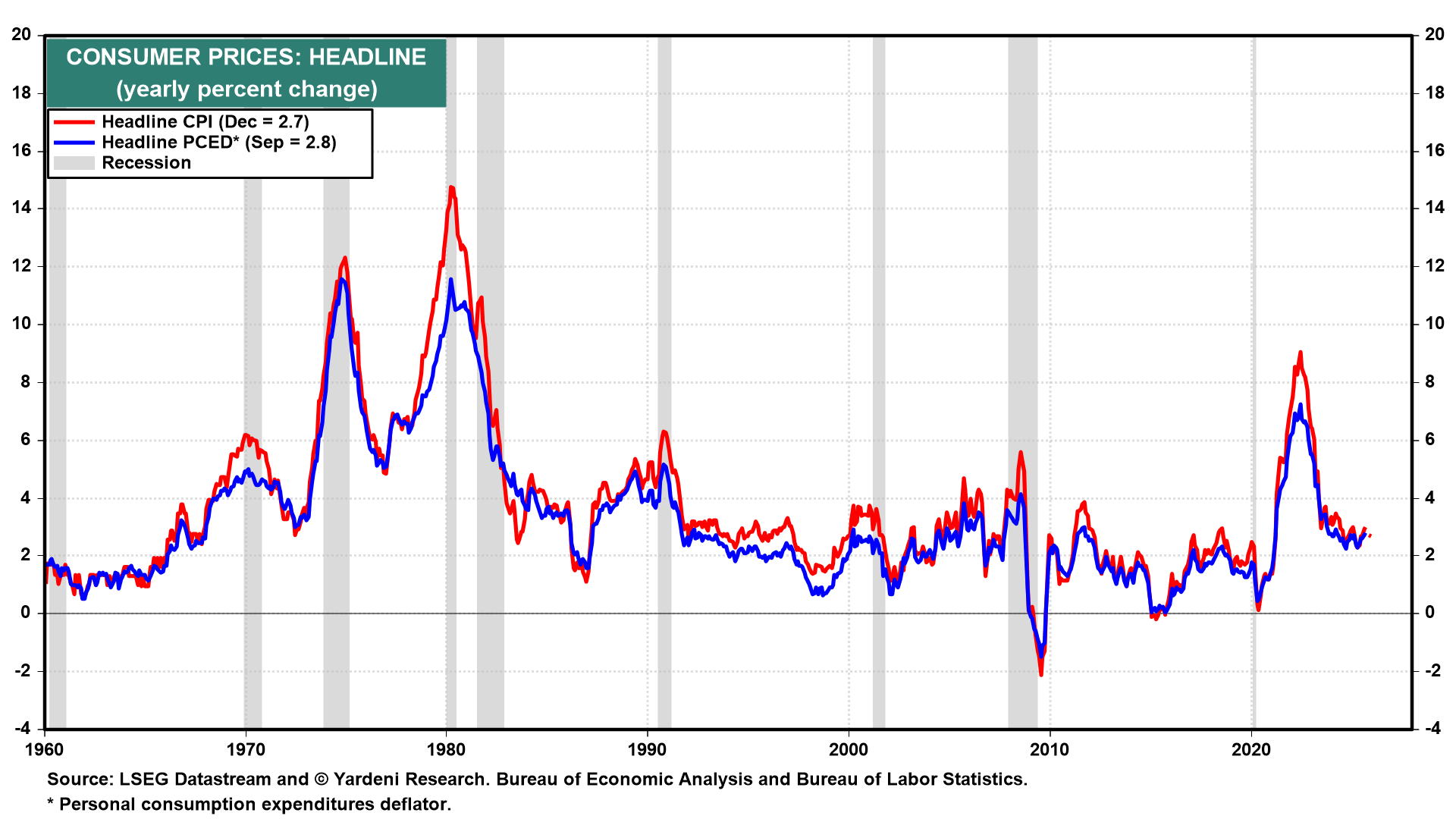 (3) PCE inflation. The Bureau of Economic Analysis will use the average of September and November CPI data to produce an October PCED reading (Thu). The Cleveland Fed's Inflation Nowcasting model is projecting headline and core PCED inflation rates of 2.65% y/y and 2.70% in November (chart).