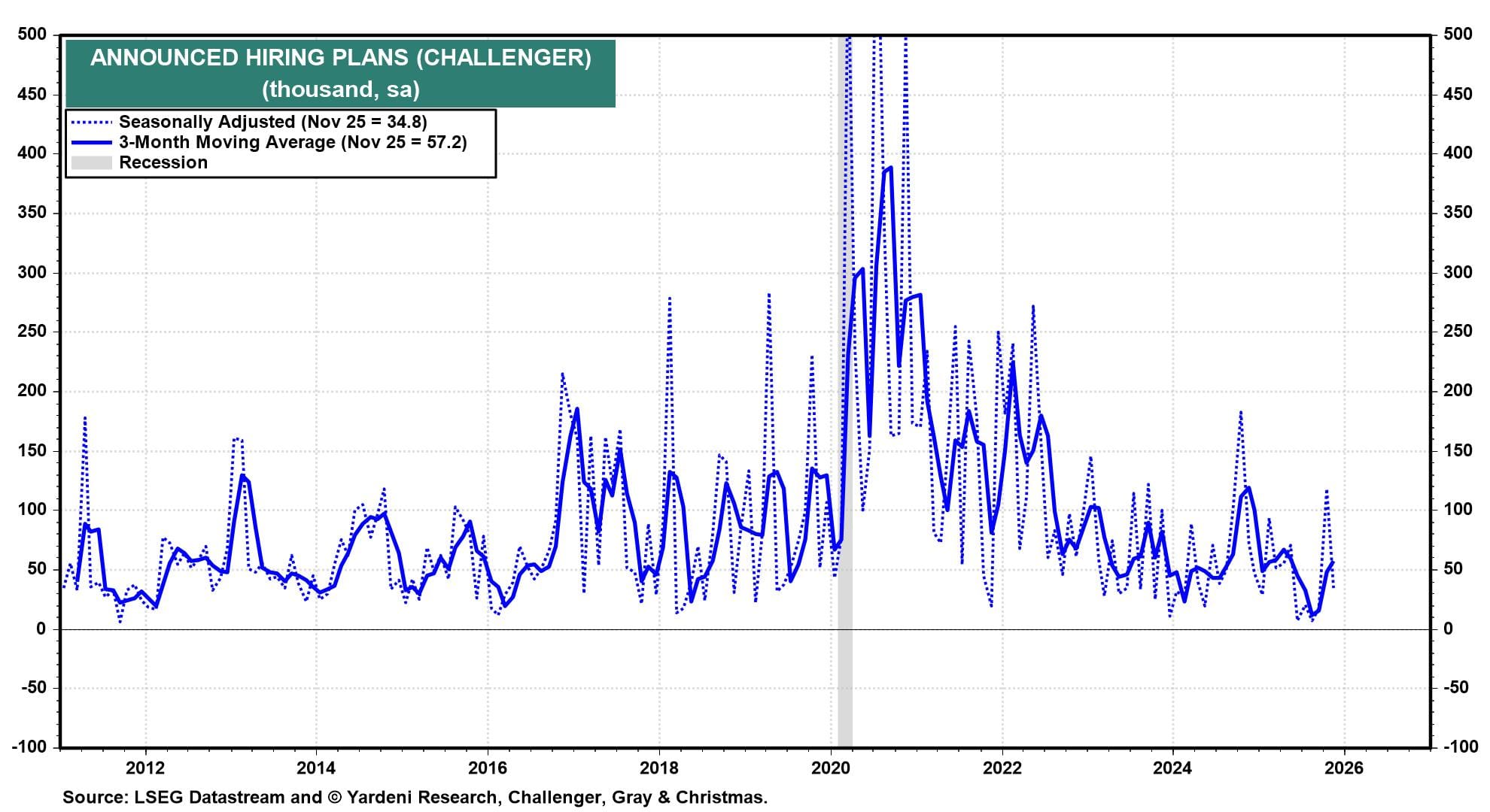 (3) JOLTS series. Given the market's extreme focus on the health of labor markets, November JOLTS figures (Wed) on job openings, hires, quits, and layoffs could provide timely clues. In October, job openings remained stable at around 7.7 million, while hires and total separations were little changed. A day later, we’ll get the Challenger, Gray & Christmas layoffs report (Thu) for December. November showed a sharp 53% drop in planned layoffs (chart).