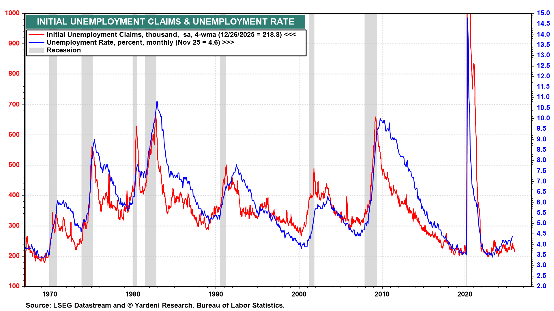 Recent data dented the view that the economy would stagger out of 2025. First, GDP grew a heady 4.3% y/y in Q3-2025. More recent data showed that initial unemployment insurance claims ended the year below the 200,000 mark. Overall, the data suggest that after surprising the bears in 2025, the economy appears on track for a solid 2026 as well.