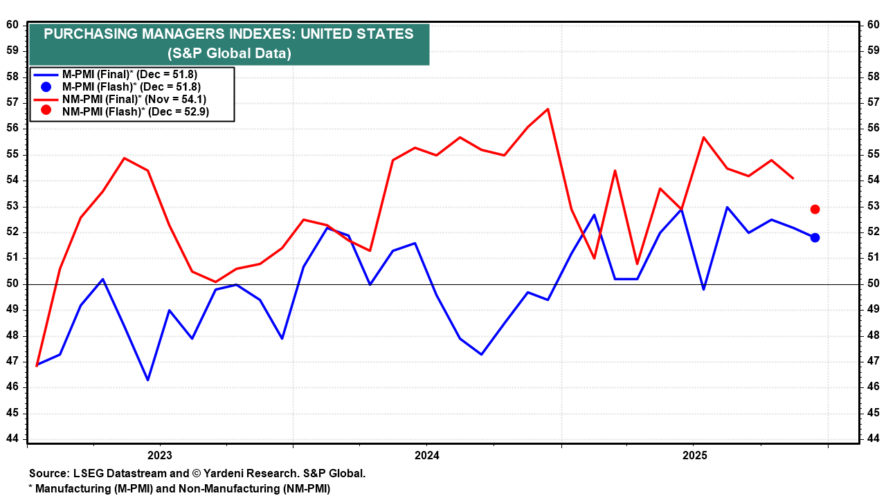 (2) PMI data. The week kicks off with the Institute for Supply Management's manufacturing purchasing managers' index for December (Mon). November's reading was 48.2. The report may receive greater attention following last week's somewhat mixed S&P Global US Manufacturing PMI (chart). Though output growth remains solid, new orders declined for the first time in a year, taking input costs down with them. ISM’s non-manufacturing PMI (Wed) could be weaker than November's reading, based on the S&P Global flash report for services.