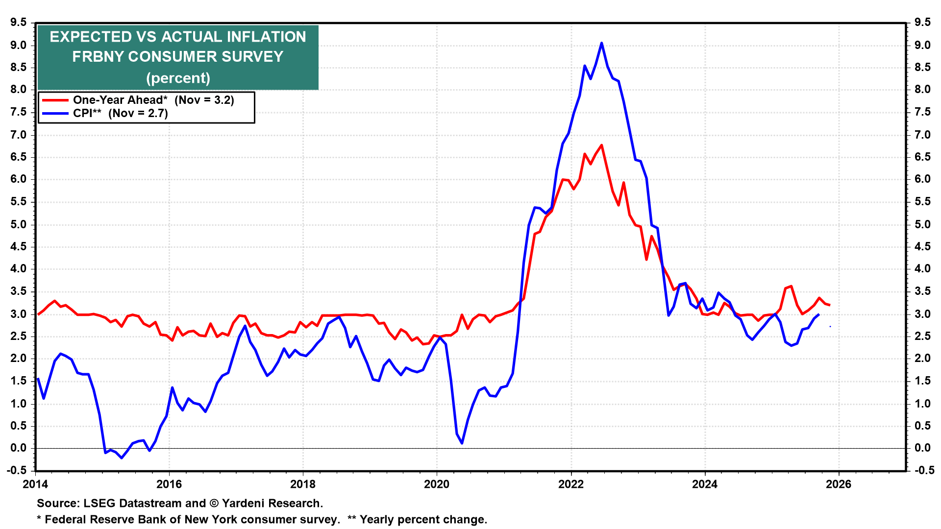 (4) Inflation expectations. Given doubts about the quality of recent government price data, post-shutdown, the New York Fed's December inflation expectations survey (Thu) could fill in some blanks. In November, expectations were steady at 3.2% (chart). Meanwhile, perceptions about job prospects improved markedly. It all makes you wonder why exactly the Fed thought it was a good idea to cut rates again last month.
