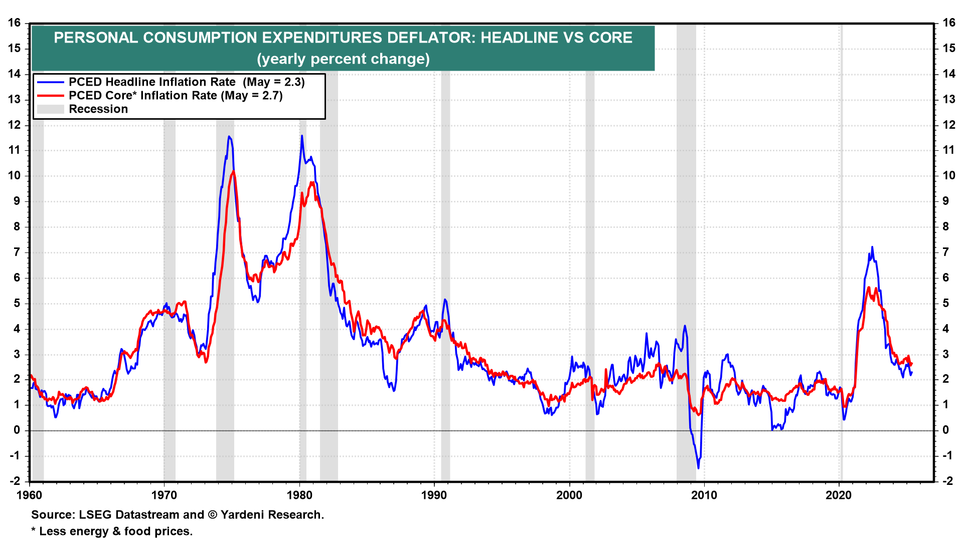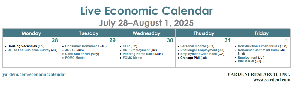 (5) Inflation. June's headline and core PCED inflation rates (Thu) are projected to be up 2.5% and 2.7% y/y, according to the Cleveland Fed's Inflation Nowcasting tracking model (chart). Both could be a bit hotter.