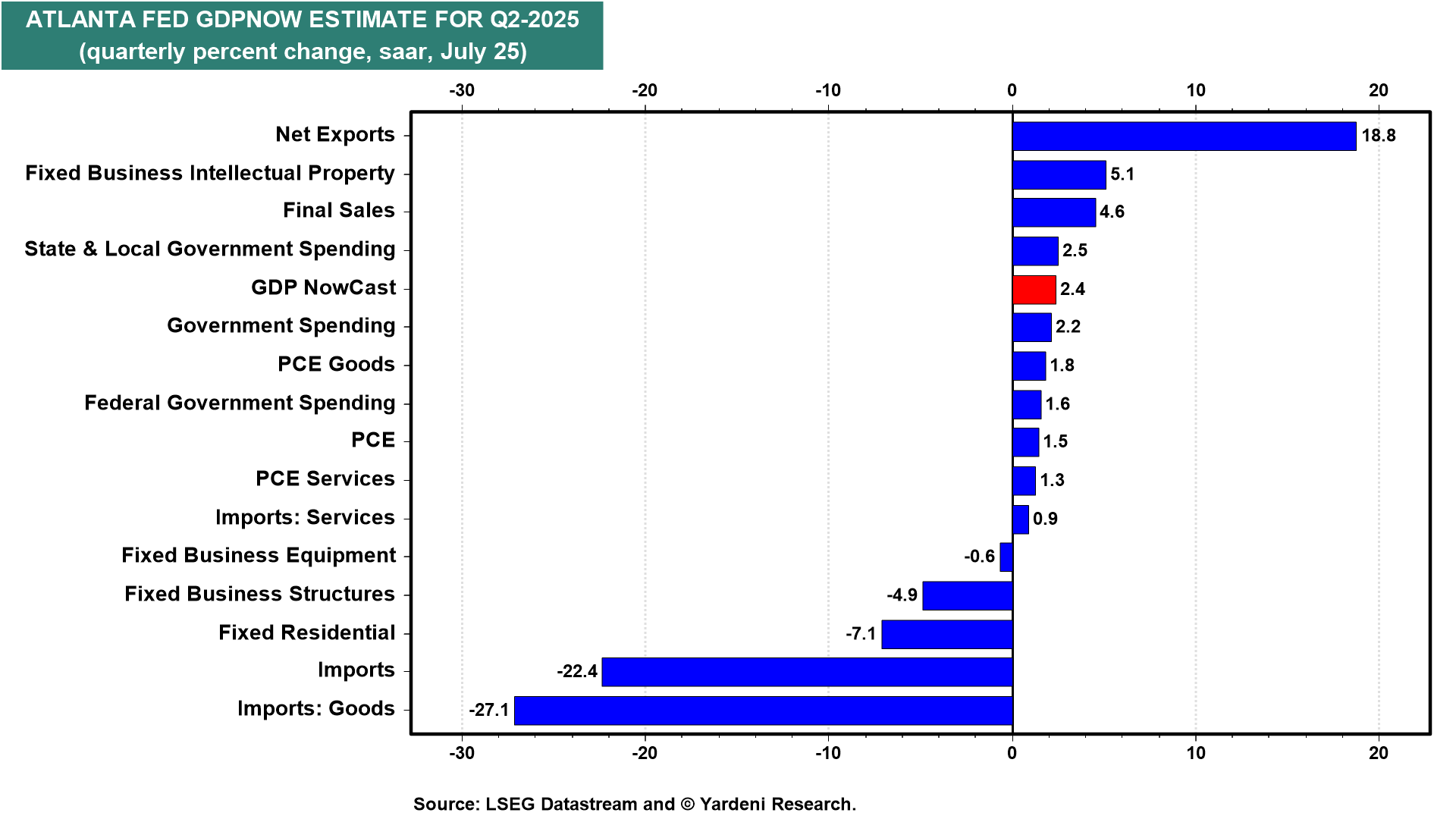 (2) GDP. After dropping 0.5% y/y in Q1, real GDP growth (Wed) is likely to expand at a 2.4% y/y rate. That is in line with the latest Atlanta Fed GDPNow tracking model (chart). While much of the rebound will likely be driven by a narrowing trade deficit, domestic demand should provide some support.