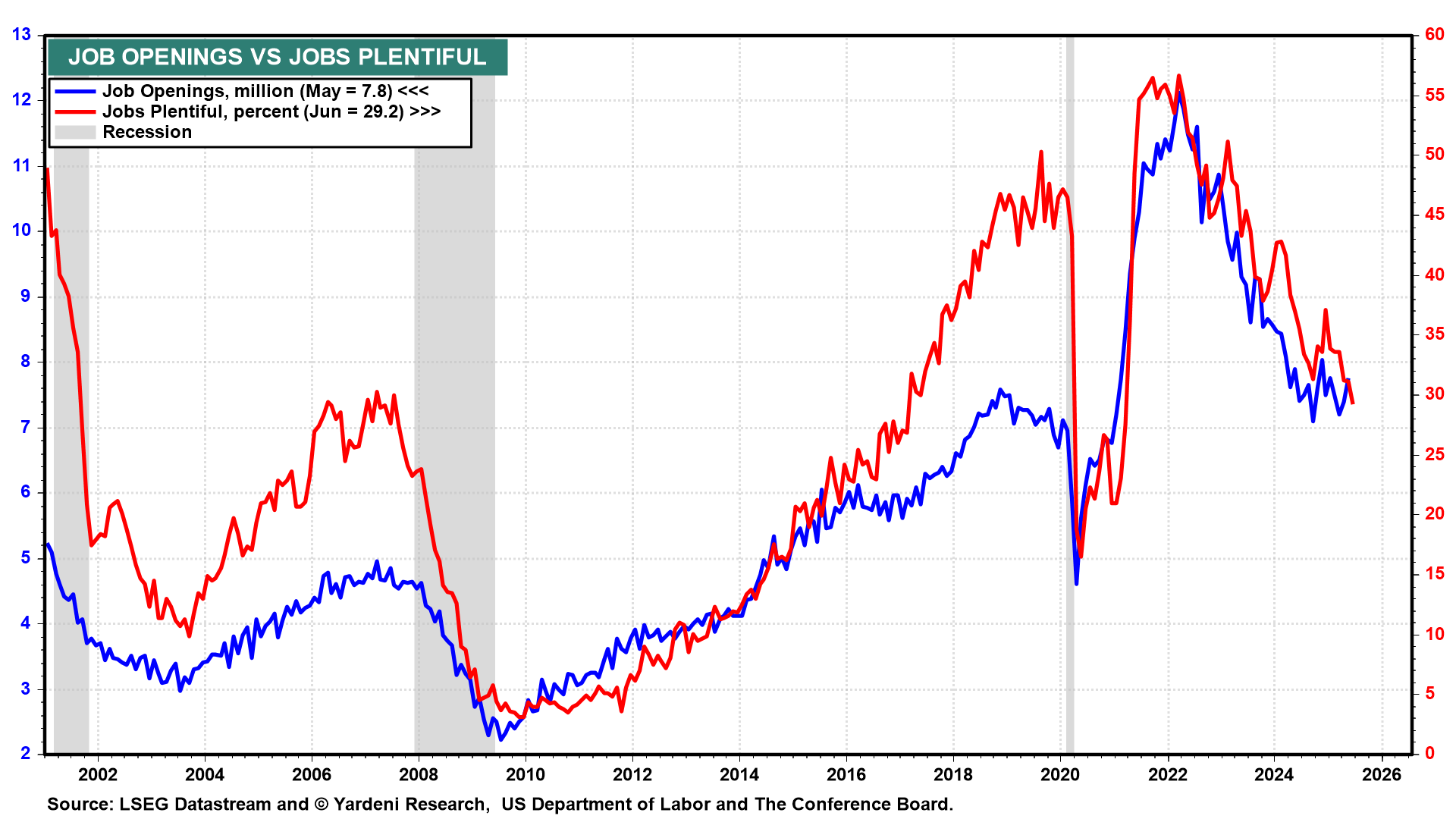 (3) Job openings. On Tuesday, the job openings data in June's JOLTS report should show that this series remains relatively high, as suggested by June's jobs plentiful series in the Consumer Confidence Index survey. That probably remained relatively high again in July (chart).