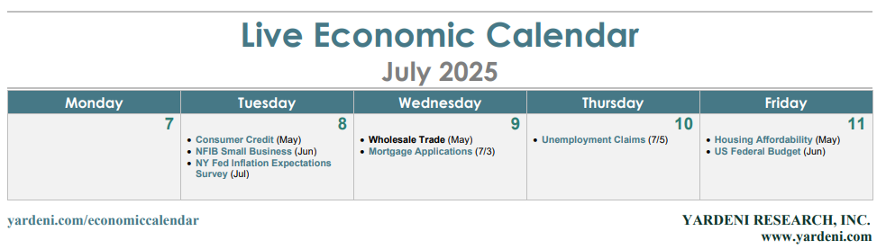 (4) Federal budget. US federal deficit figures for June (Fri) take on even greater weight considering the passage of Trump’s Big Beautiful Bill. Now that he signed it into law on July 4, let's see how the bond market reacts to it. The 10-year bond yield rose to 4.35% on Thursday following the better-than-expected June employment report. We are still forecasting that the yield will range between 4.25% and 4.75% through the end of this year.