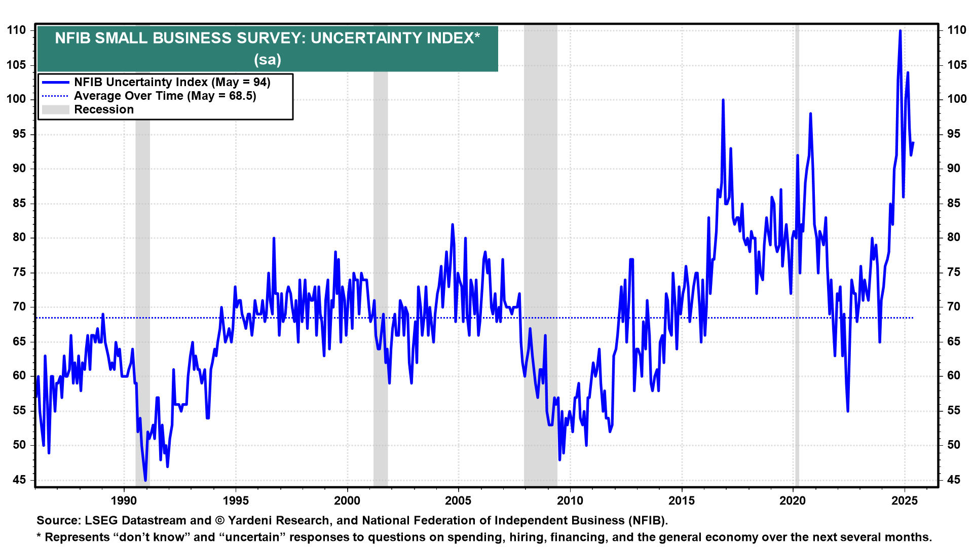 (1) NFIB business optimism. The results of the National Federation of Independent Business June survey of small business owners (Tue) are likely to show some improvement. The Optimism Index should rise from 98.7 in May closer to 100.0, reflecting a steadier-than-expected economy as confirmed by record stock prices. The Uncertainty Index should edge down for the same reason despite lingering uncertainties about Trump's tariff policies (chart). We will be focusing on the survey's timely labor market indicators for confirmation that the jobs market remains resilient.