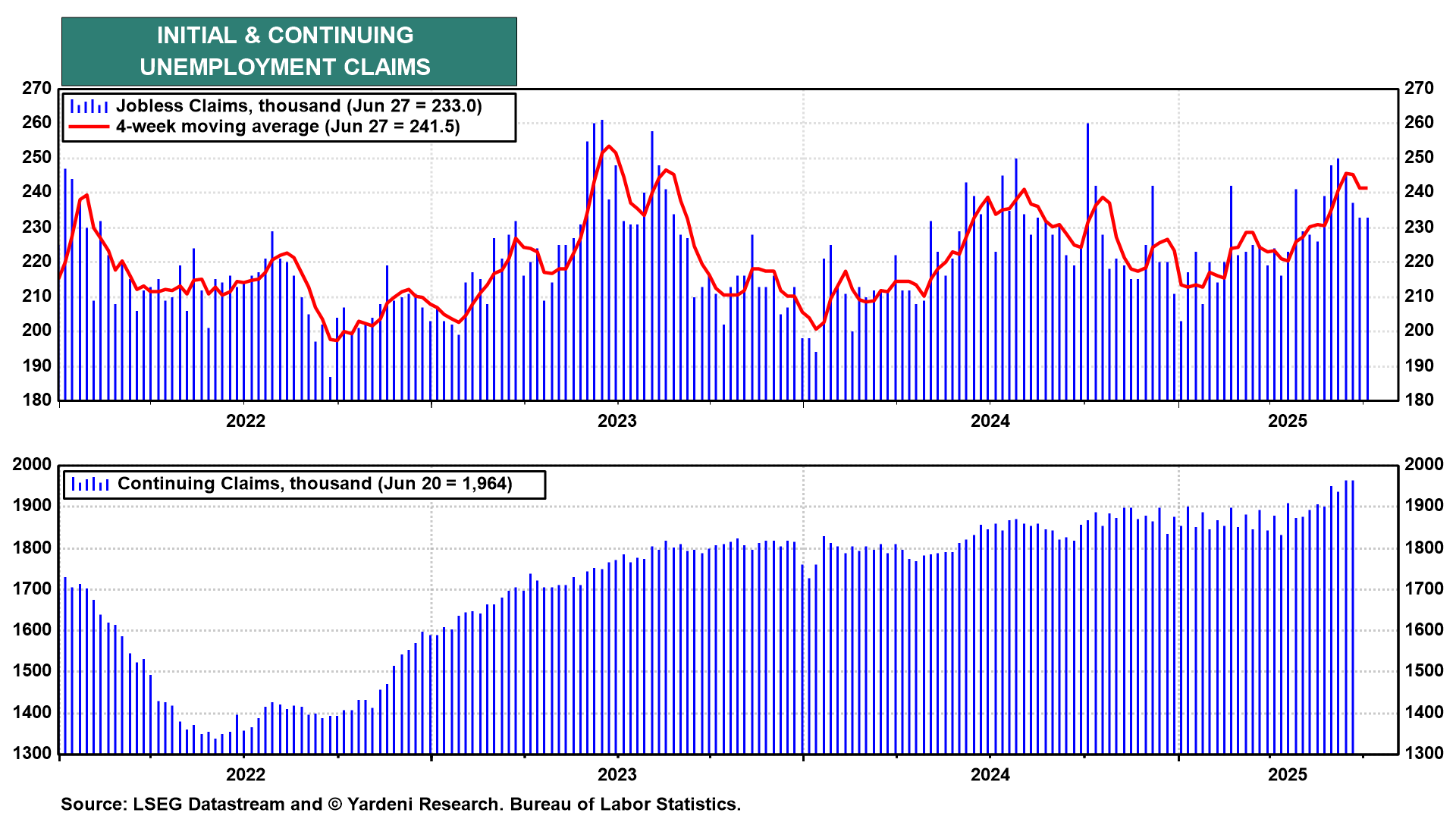 (3) Unemployment claims. We expect initial unemployment claims (Thu) to remain within the recent low range, continuing to prove wrong recent worries about layoffs (chart). It's possible that continuing claims will continue to suggest that the duration of unemployment is increasing, though that was not confirmed by June's decline in the unemployment rate to 4.1% from 4.2% in May.
