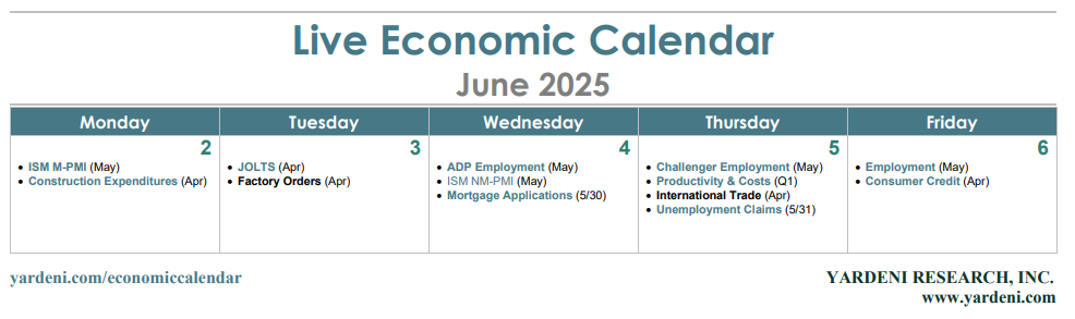 (5) Employment & unemployment. May's jobs report (Fri) has the greatest potential to change minds at the Fed on whether policymakers think the time is right to ease. We’re expecting a gain of between 125,000-150,000 jobs, mostly spread across leisure & hospitality, financial services, and health care as the Baby Boomers spend their vast retirement savings. Based on recent trends of weekly unemployment insurance claims, the jobless rate should stay around 4.2%. It could be a bit higher if the duration of unemployment increases slightly.