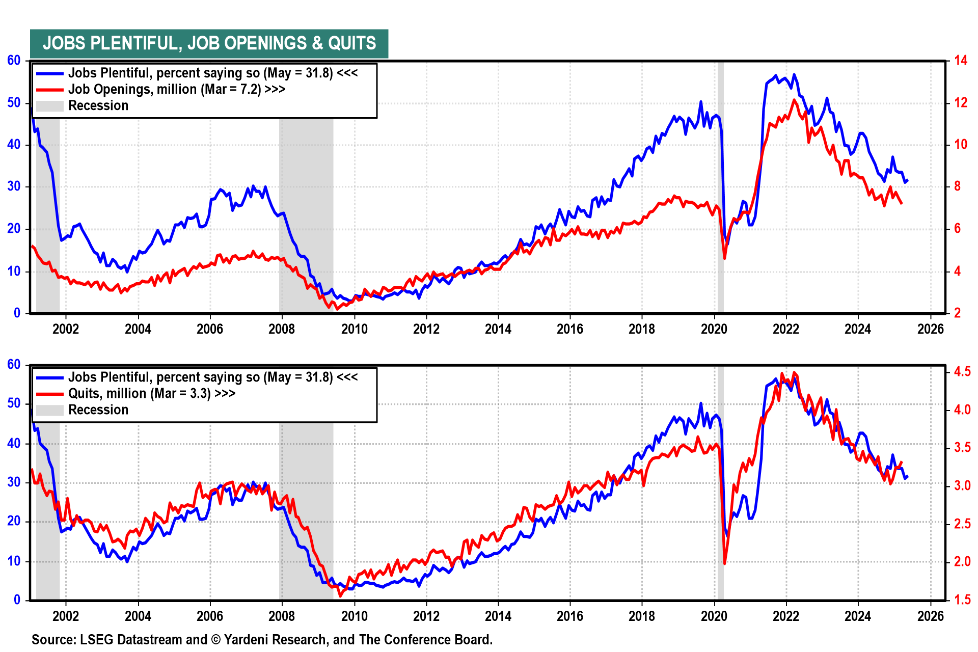 (3) JOLTS. April's Job Openings and Labor Turnover Survey (Tue) should signal that the jobs market remained sound. The May consumer confidence index survey confirmed this assessment, as 31.8% of respondents agreed that jobs are plentiful (chart).