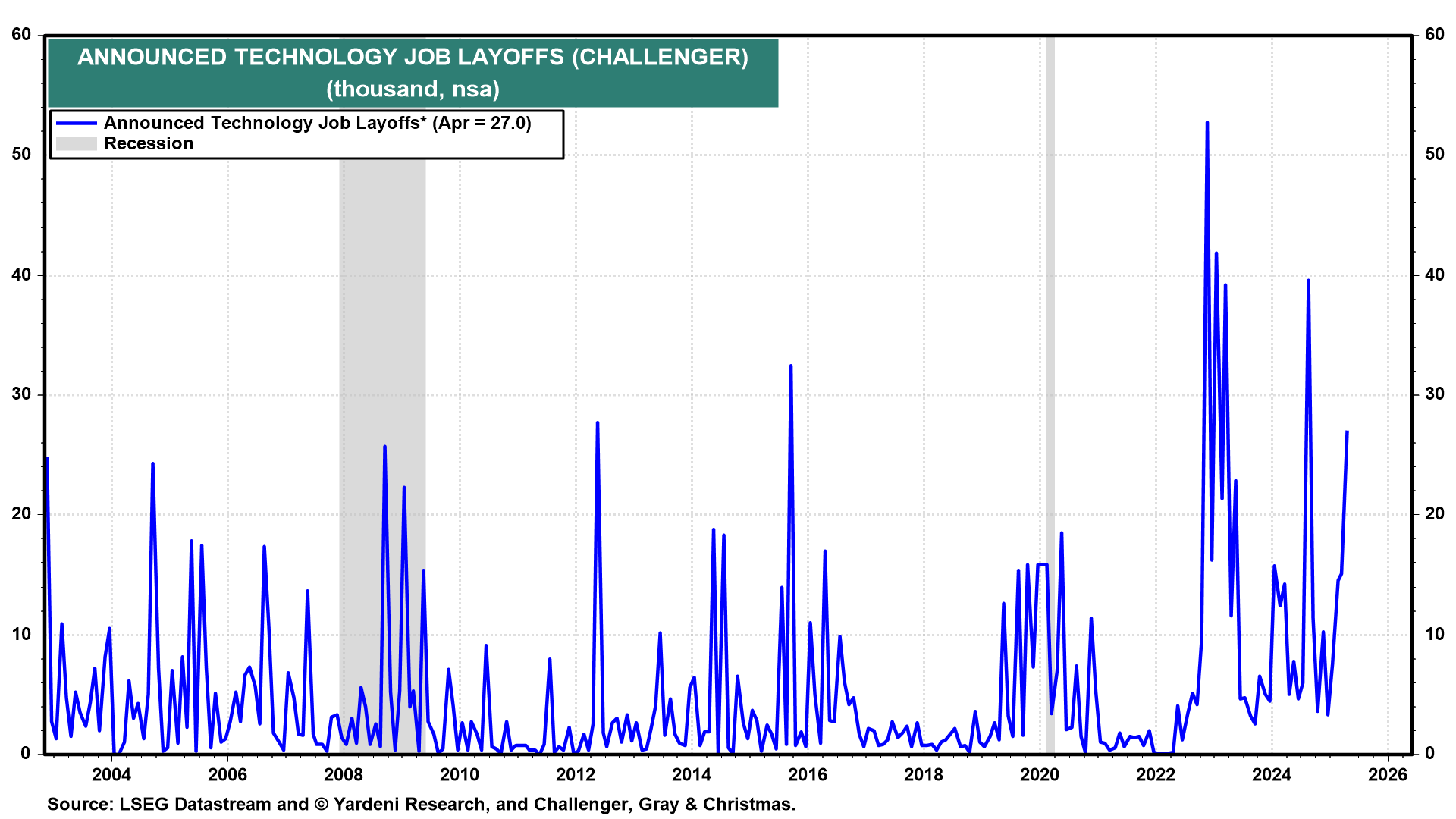 (4) Challenger layoffs. Recently, the Challenger job-cuts report is proving that science fiction is becoming science fact in real time. May's report (Thu) will show that AI took more IT jobs as Microsoft, CrowdStrike, Duolingo, Walmart, news site Business Insider and others shed staff (chart). That’s not the whole story, though. For all the fanfare surrounding Elon Musk’s few months in Washington, his Department of Government Efficiency (DOGE) achieved little. And layoffs more broadly across sectors remain rather subdued.