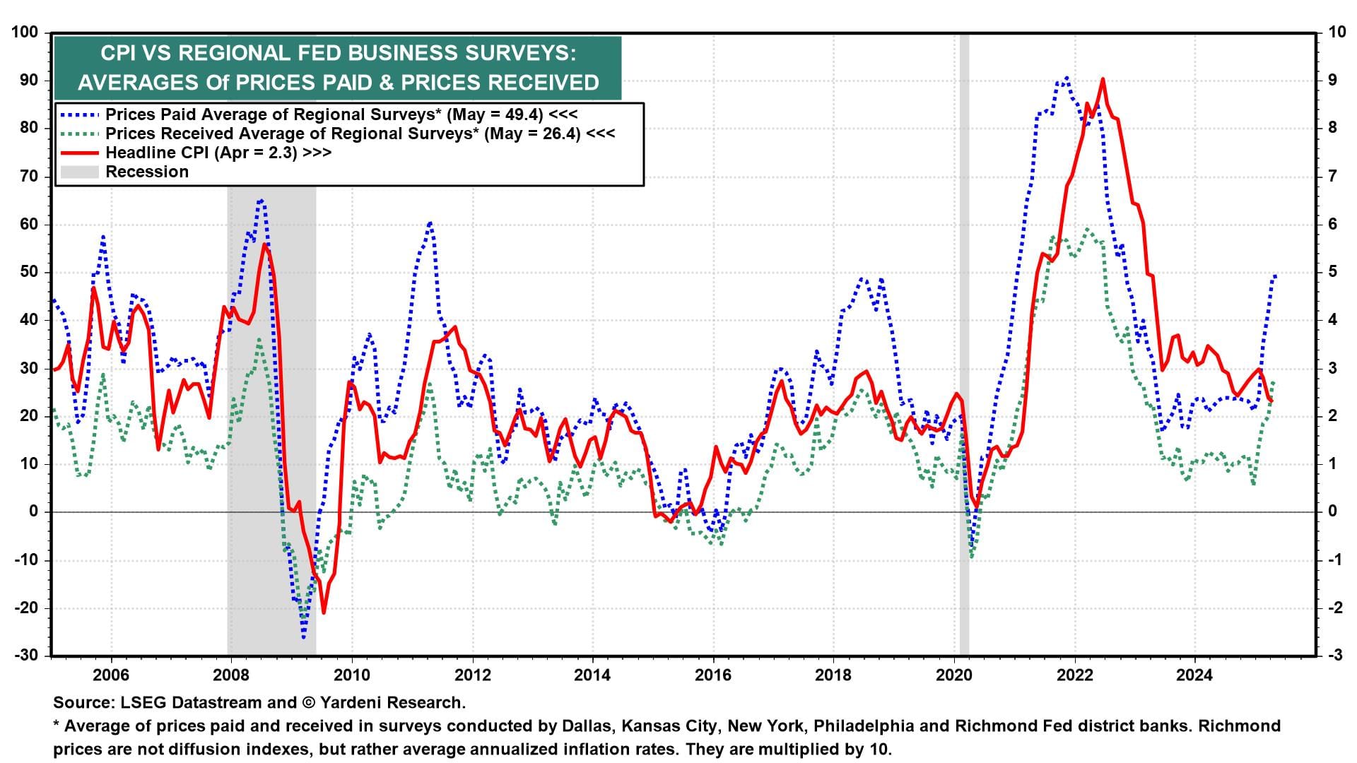 (2) Inflation: CPI. May's Consumer Price Index (Wed) could shed light on whether Trump's tariffs are starting to boost inflation. Since April's 2.3% y/y increase, the Cleveland Fed’s Inflation Nowcasting model has been signaling slight pickups in May (2.4%) and June (2.7%). However, gasoline prices were flat in May, and the Manheim Used Vehicle Value Index eased during the month. The big surprise could be how little Trump's tariffs are boosting inflation despite upward pressures on prices-paid and prices-received indexes in the Fed's regional business surveys (chart).