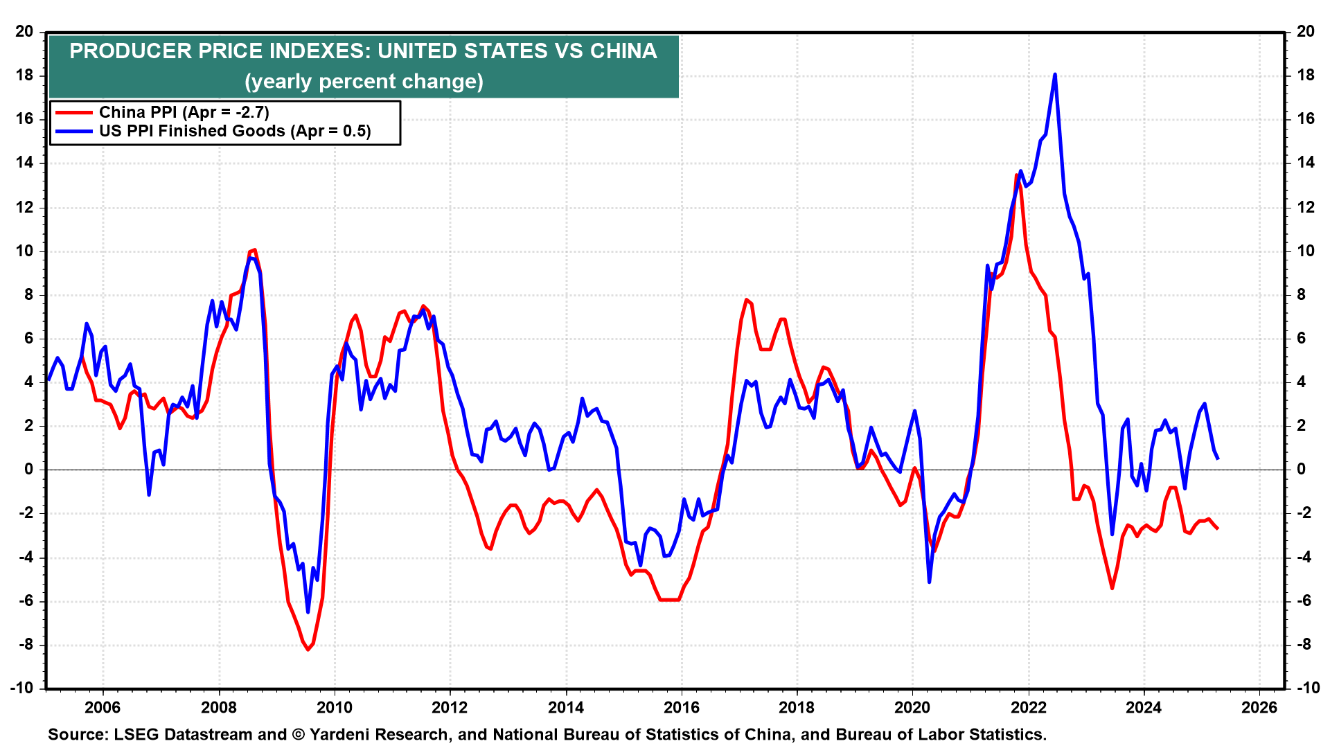 (3) Inflation: PPI. The US Producer Price Index (Thu) for goods has been highly correlated with China's PPI, which fell 2.7% y/y in April. The fact that Asia's biggest economy is grappling with deflation could offset tariff-related price pressures. Since the April drop in China's PPI was the steepest in six months, there's reason to expect its deflation isn't going away anytime soon.