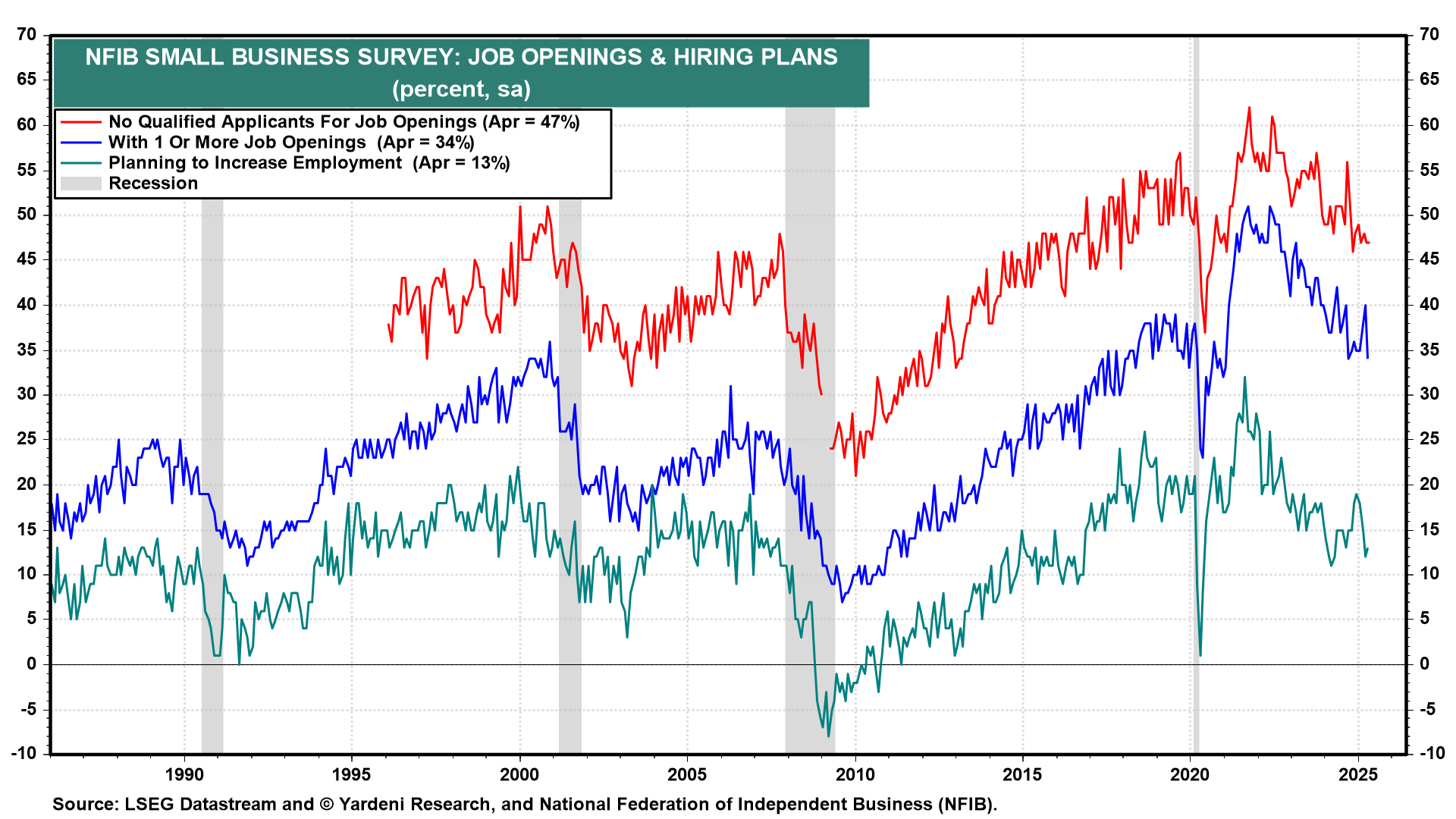 (4) Small business owners survey. When the National Federation of Independent Business releases its latest survey of small business owners (Tue), the real insights will come from the labor market indicators. We expect the May survey to confirm the resilience of employment conditions despite the tariffs. It should help, too, that the May data period coincided with Trump’s either postponing or lowering tariffs.