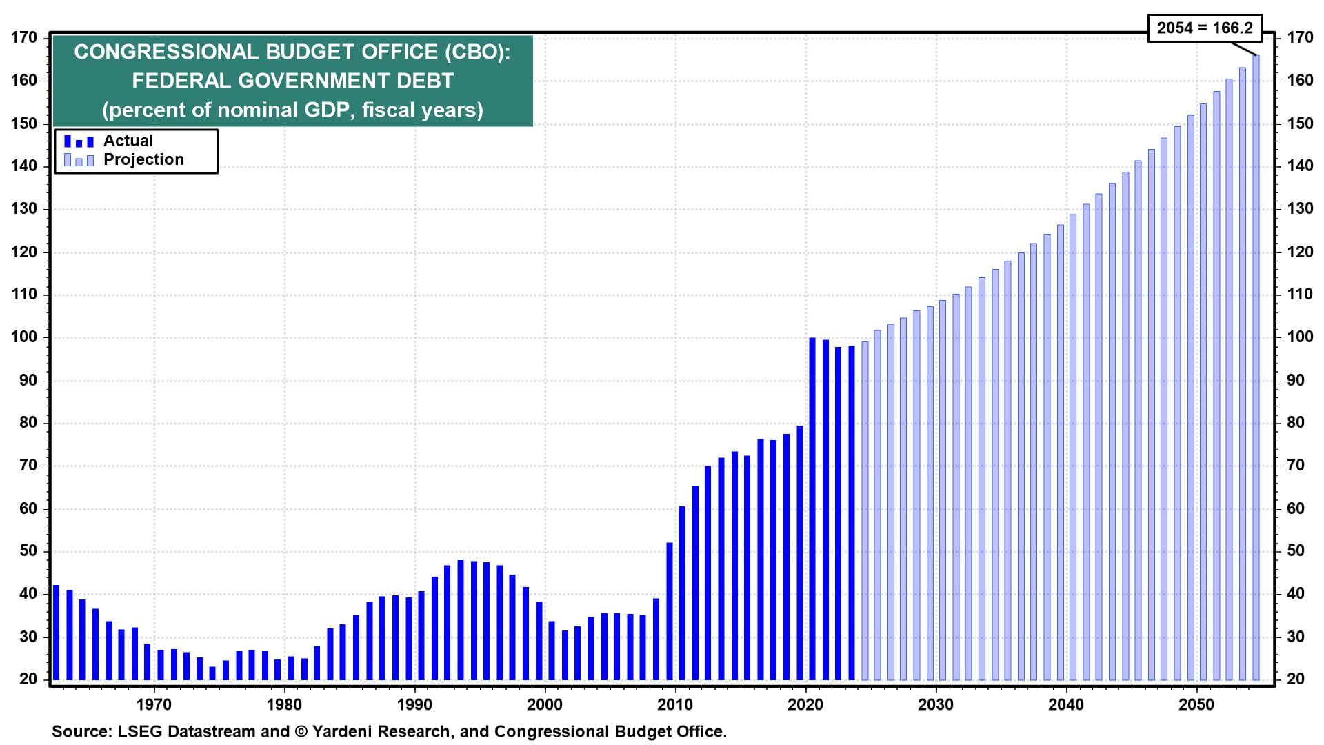 (5) Federal budget. It's anyone's guess what Trump's "Big Beautiful Bill" will look like after the Senate works it over this week, especially given how ugly the process has gotten as the Trump-Musk big beautiful bromance implodes in real time. Already, the current version is seen adding between $2-$5 trillion to the federal debt—on top of the $20 trillion increase the Congressional Budget Office currently projects over the next 10 years (chart). Expect the Bond Vigilantes to have lots to weigh in about this trajectory.