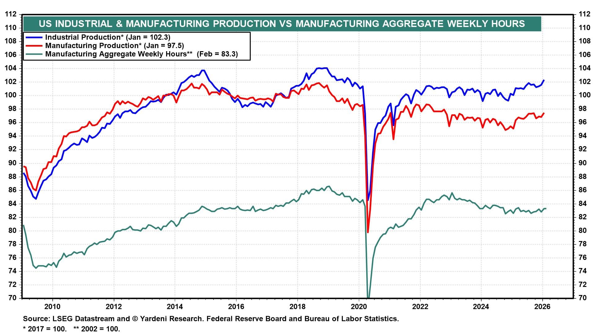 (2) Industrial production. Fed officials on the lookout for signs the economy is holding its own found them in January's industrial production (+0.7% m/m) and capacity utilization (76.2%, the highest since July) data. The February data (Mon) should confirm that industrial production remains on a modest uptrend (chart).