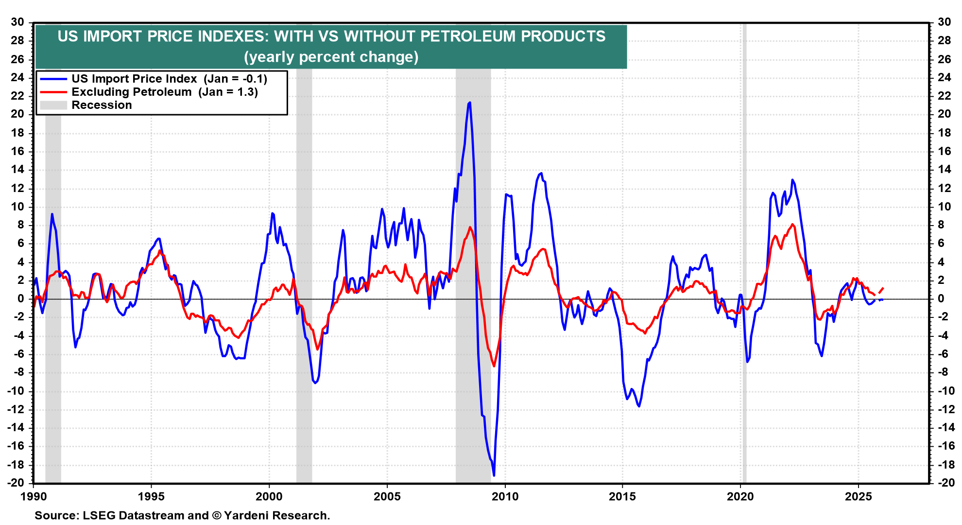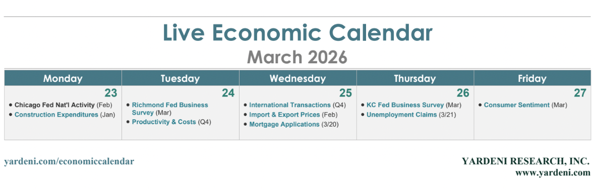 (2) Import/export prices. The February import price data (Wed) follows January's 0.1% m/m decline (chart). This is a pre-war report, so it won't reflect the jump in commodity prices during March. Q4 productivity and labor cost data (Tue) should confirm that both were disinflationary last year. We expect to see more of that in 2026.