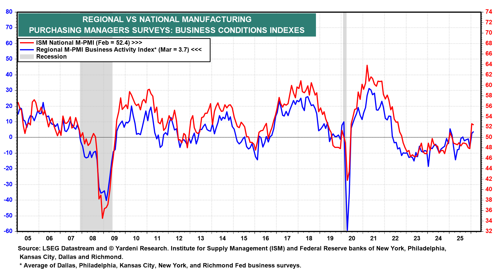 (3) Business surveys. At a moment when Fed officials are scrambling to keep up with economic zigs and zags, regional surveys should garner extra attention (chart). We'll hear from the Chicago Fed (Mon), the Richmond Fed (Tue), and the Kansas City Fed (Thu). Also, S&P Global releases its March purchasing managers' indexes (Tue) for both manufacturing and services. The impact of the war on the economy may become observable.