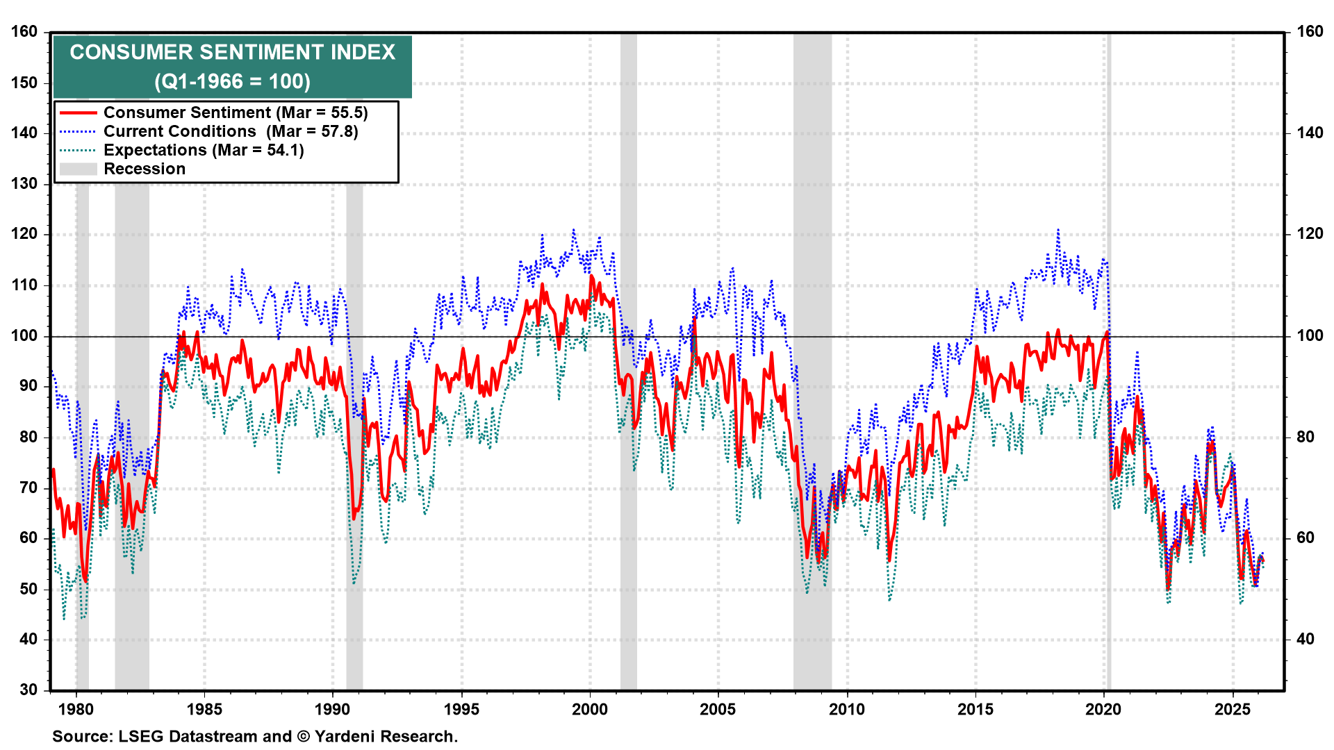 (1) Consumer sentiment. The University of Michigan will report its final March consumer sentiment index (Fri). The previous reading showed sentiment falling to 55.5 from 56.6 (chart). This week's update should show that surging gas prices are unnerving households around the country.