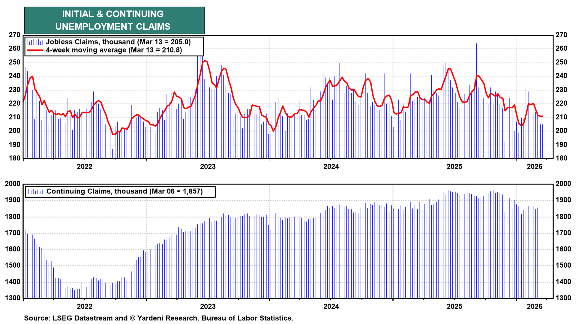 (4) Jobless claims. Weekly unemployment insurance claims remain upbeat, as claims continue to moderate (chart). Any reading in the neighborhood of last week's 205,000 level would confirm that layoffs remain low.