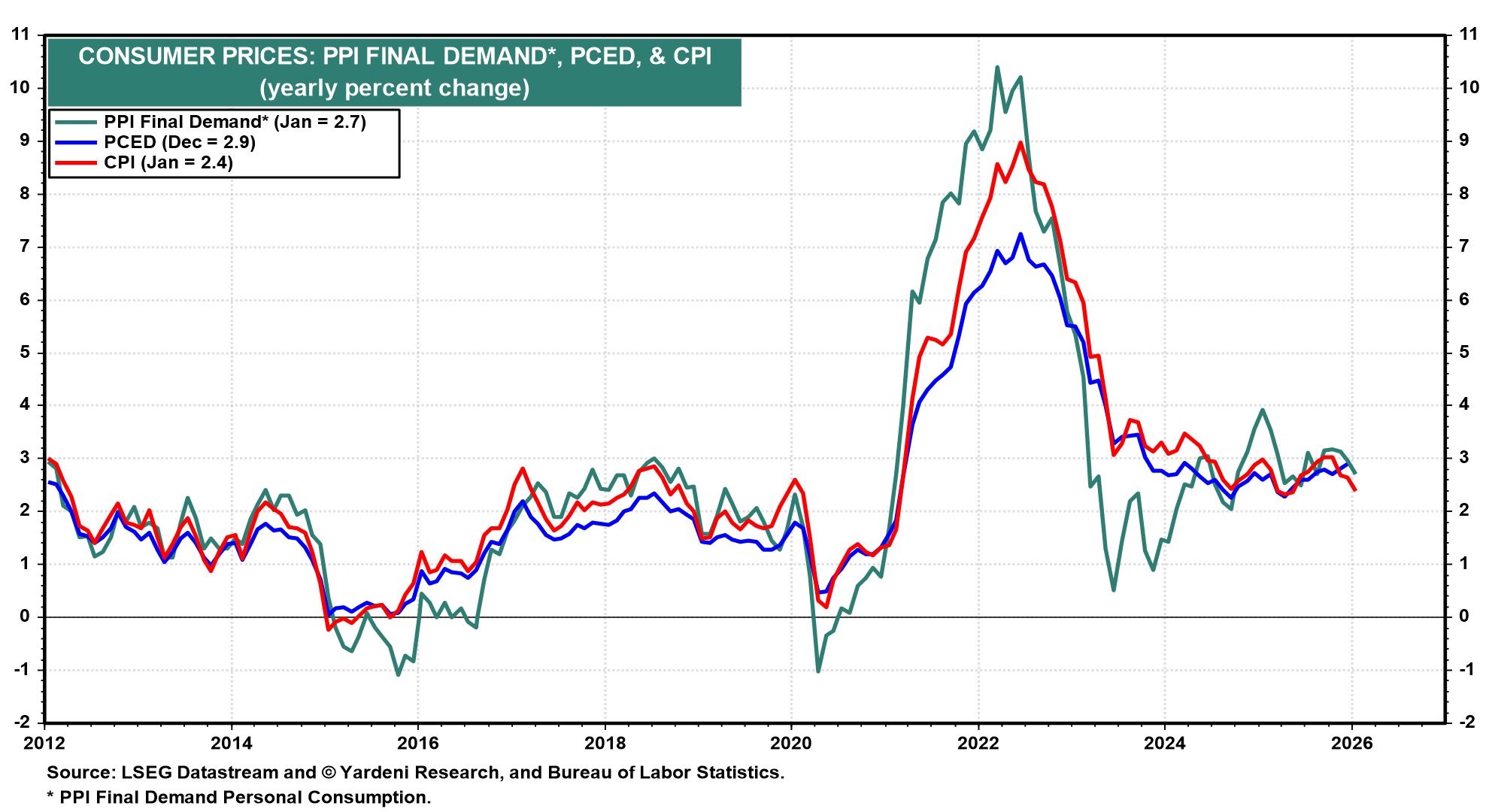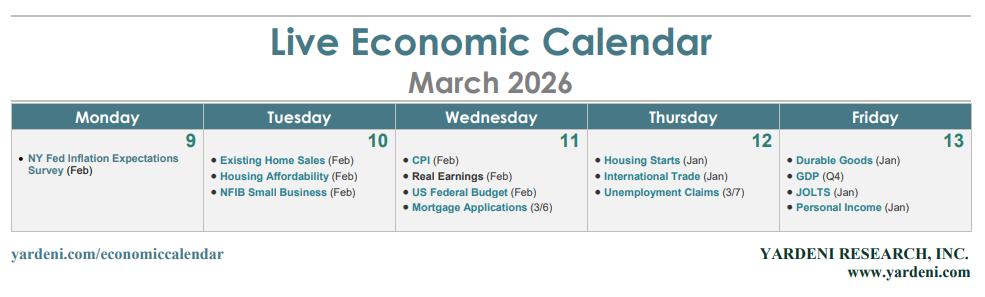 (2) CPI. After dipping to 2.4% y/y in January — and a 2.5% core rate — many expect consumer prices to hold largely steady in February (Wed). That includes the Cleveland Fed’s model, which forecasts a roughly 0.2% m/m increase for both headline and core CPI. Of course, this, too, could be the calm before the inflationary storm to come.