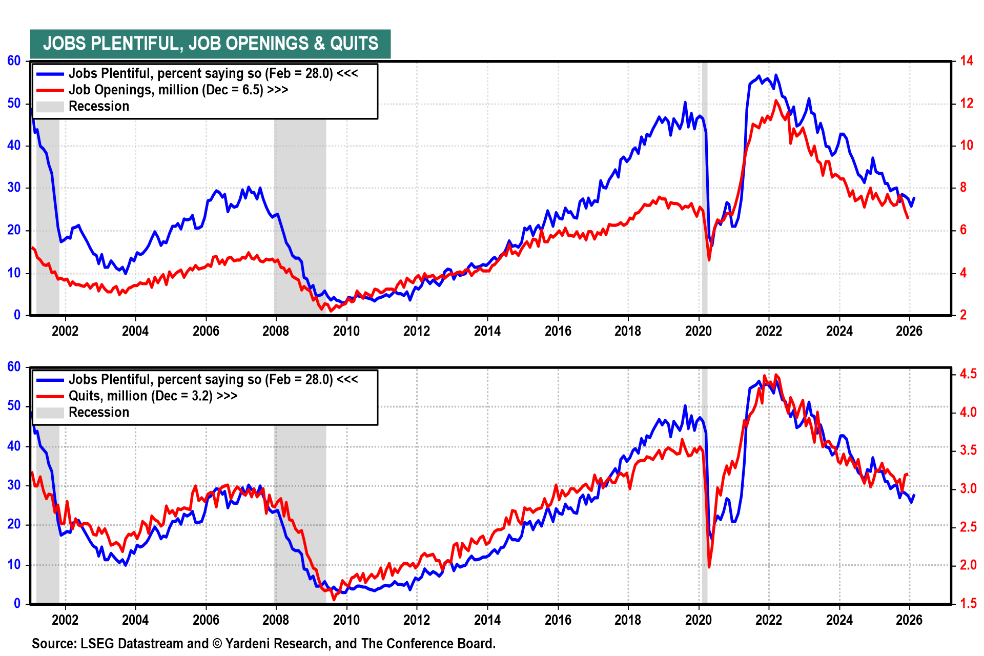 (4) JOLTS and claims. News that US job openings dropped to the lowest level in more than five years in December fits with more recent signs of slowing labor markets. Markets will pay close attention to January JOLTS data (Fri) for any hints of further deterioration (chart). Meanwhile, trends in initial weekly jobless claims (Thu) — coming in at 213,000 in the previous week — continue to indicate a stable labor market with low layoffs.