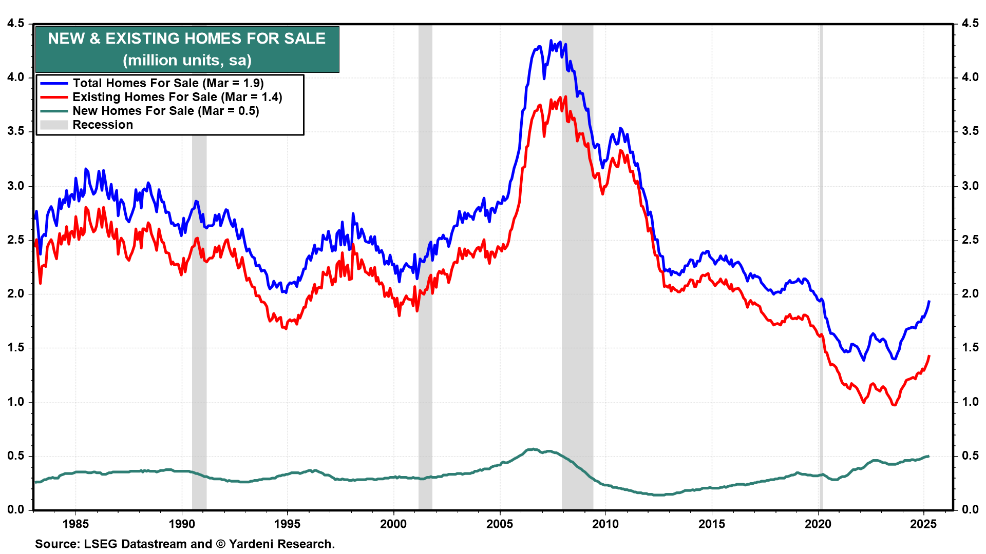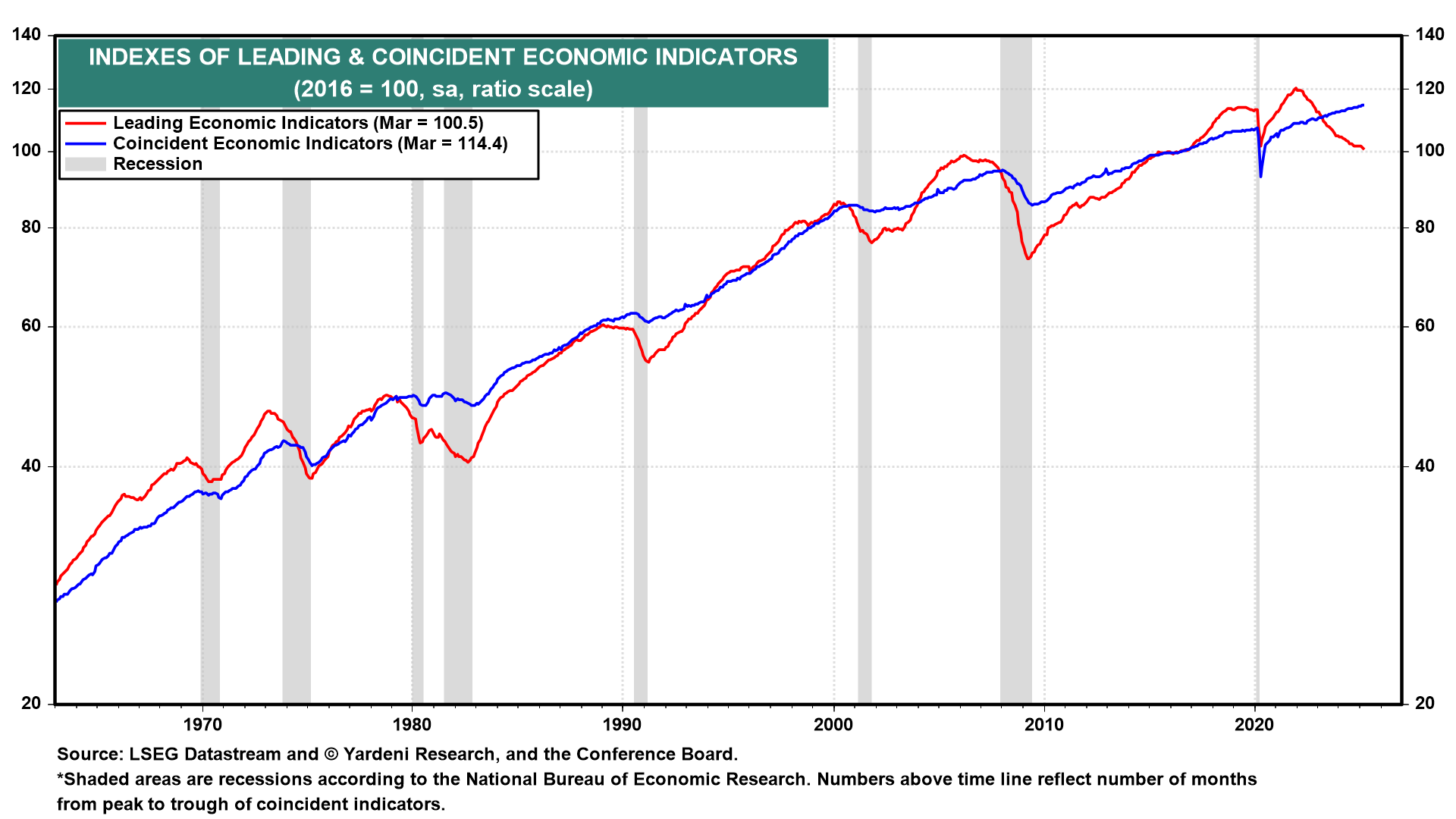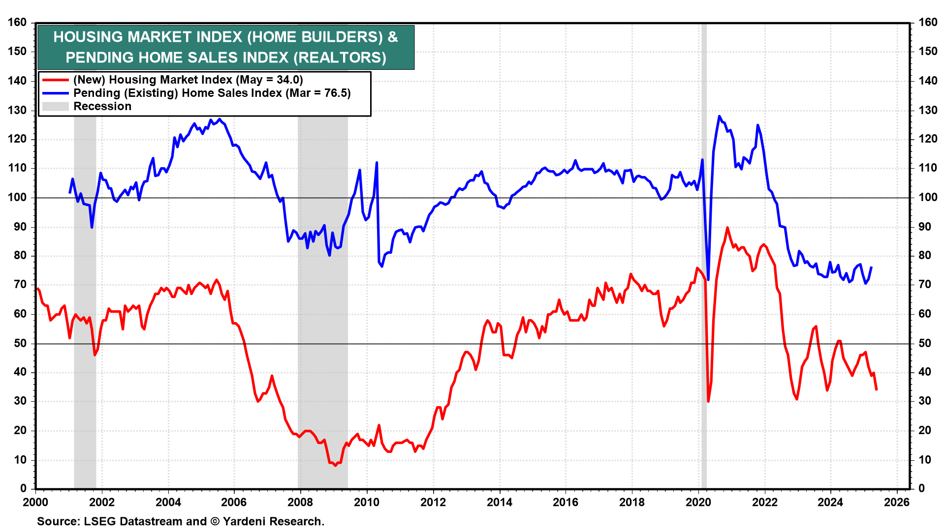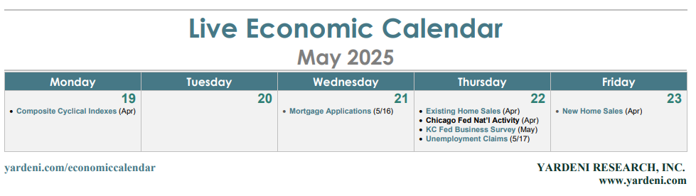 (2) Composite economic indicators. April's composite cyclical indexes (Mon) might feature their own eye-of-the-beholder dynamic (chart). The leading economic indicators series is likely to drop again in April, given the tariff-related battering to consumer expectations. Yet the coincident economic indicators series is likely to be more attuned to April's solid gains in employment. Odds are, an uptick in the CEI will better reflect where the economy is heading as the second half of 2025 beckons.