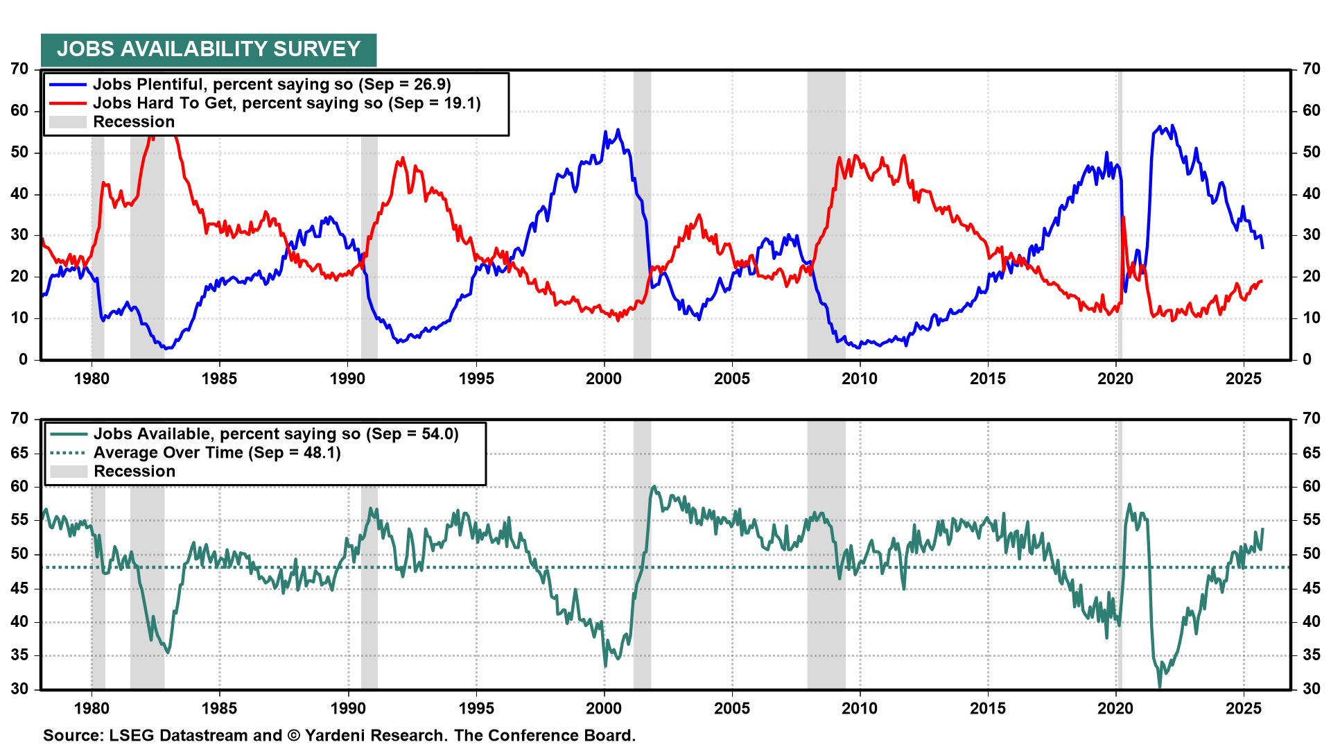 (1) Consumer confidence. The Conference Board's Consumer Confidence Index survey (Tue) likely remained steady in October around the 94 level. We'll be watching for signs of stabilization in the jobs availability data (chart).