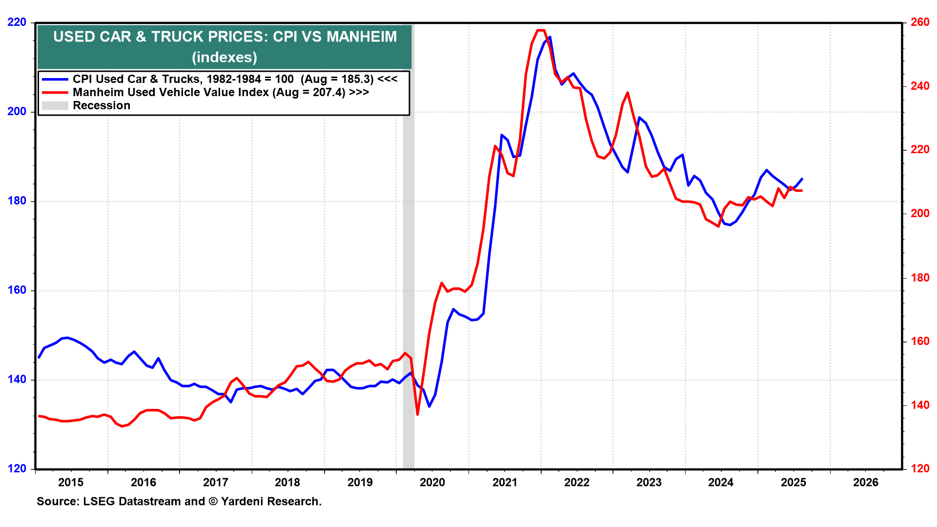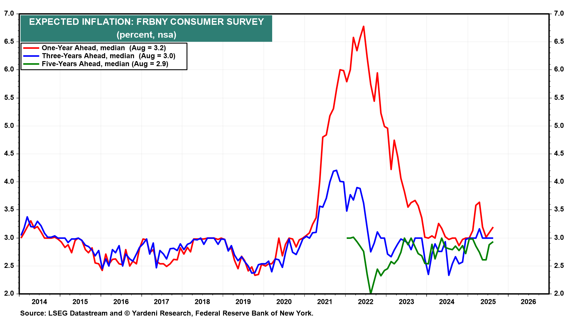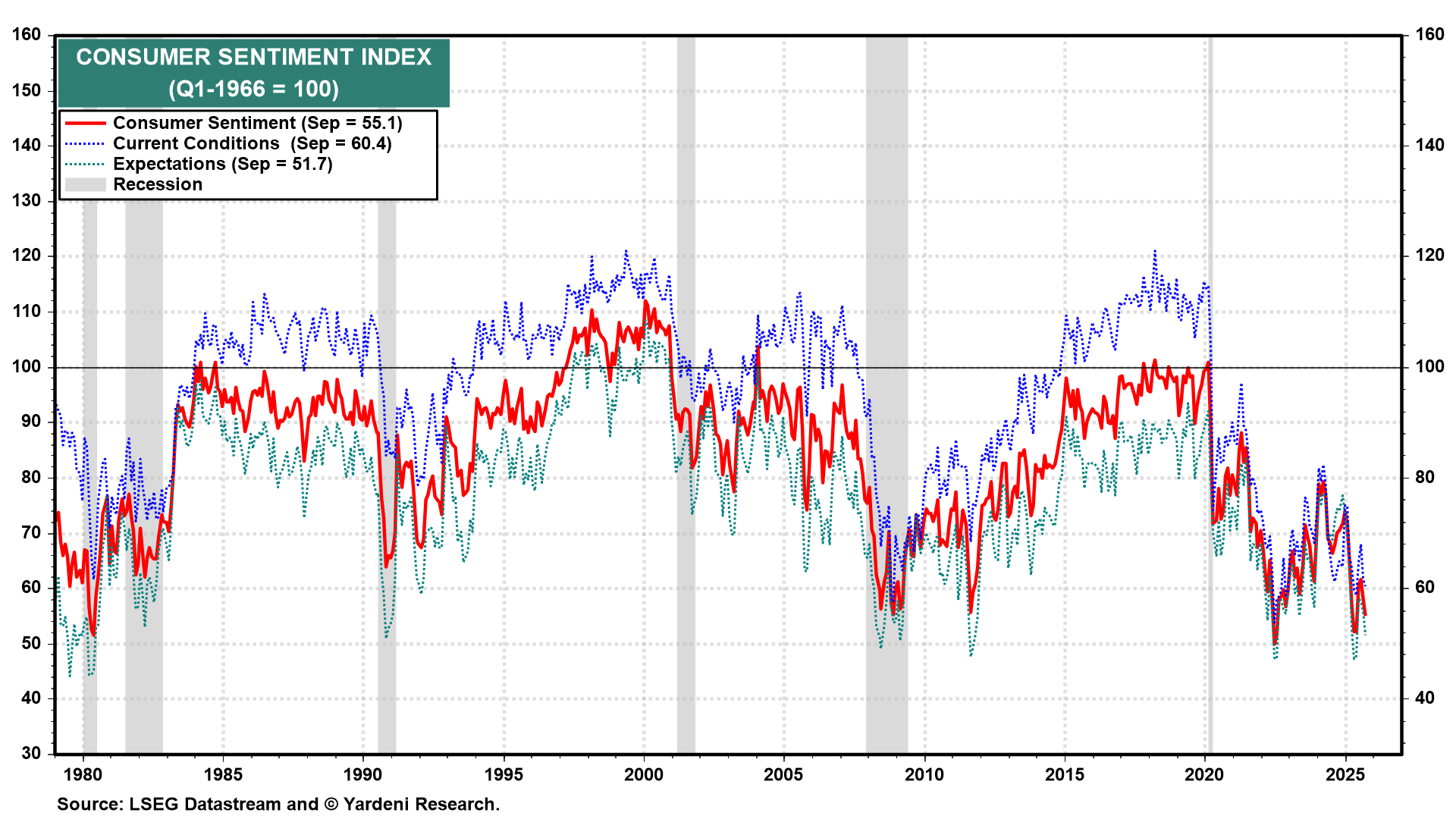 (4) Consumer sentiment. With the stock market on a tear, the Fed cutting the federal funds rate, and Trump's tariffs making fewer headlines, the University of Michigan's preliminary consumer confidence survey for October (Fri) should rebound. At the very least, it should confirm that the low level of layoffs and positive wealth effect are helping to stabilize consumer sentiment.