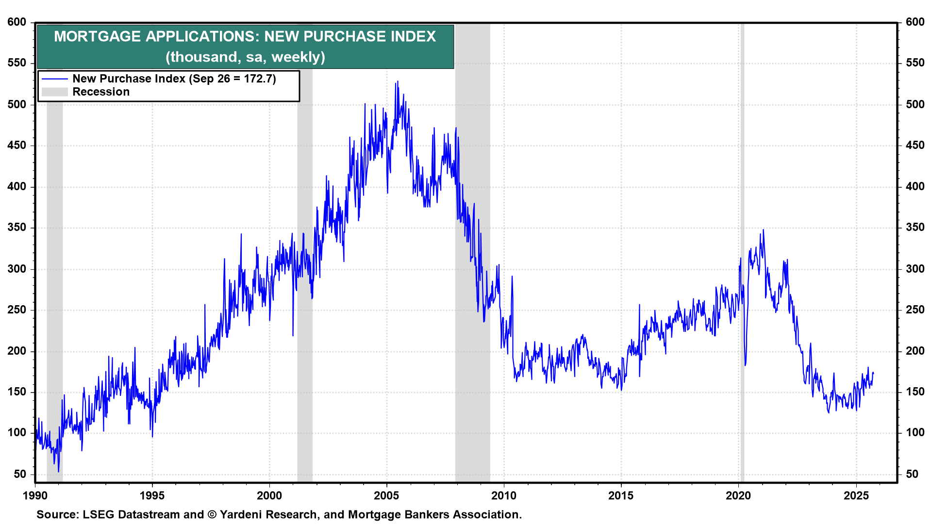 (2) Mortgage applications. Recent bond market volatility is causing considerable noise in the Mortgage Bankers Association's weekly data. Its new purchase index fell 1.0% during the week of September 26. If the Fed continues to pivot toward rate cuts, a rebound in housing activity seems likely.
