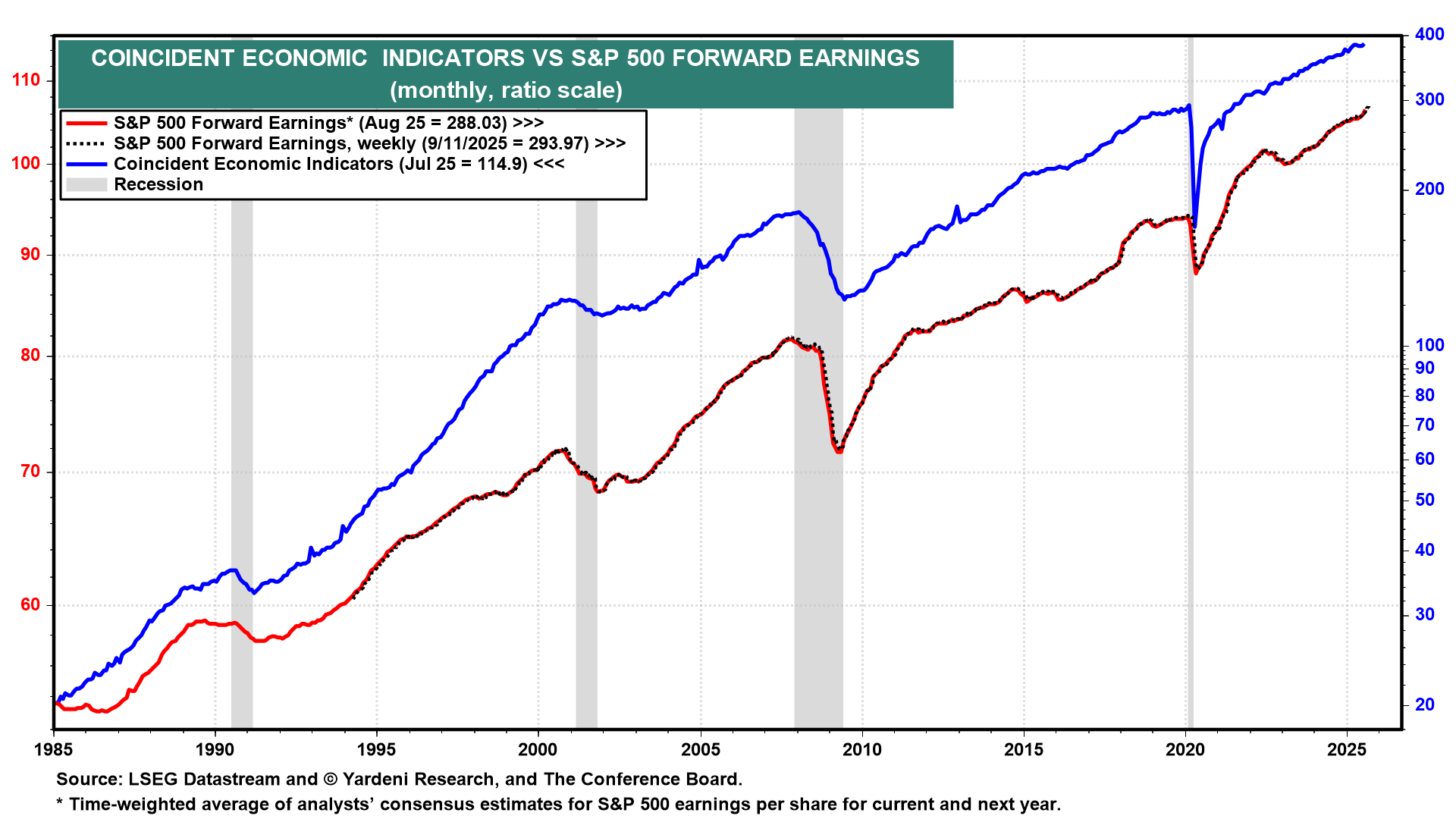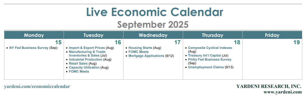 (4) Composite cyclical indicators. A soft August reading is likely from the Conference Board’s Index of Coincident Economic Indicators (Thu). That's because payroll employment and industrial production were weak in the previous month. On the other hand, our favorite weekly coincident index of the economy is the S&P 500’s forward earnings, which has recently been rising at a faster clip, reaching record highs (chart).