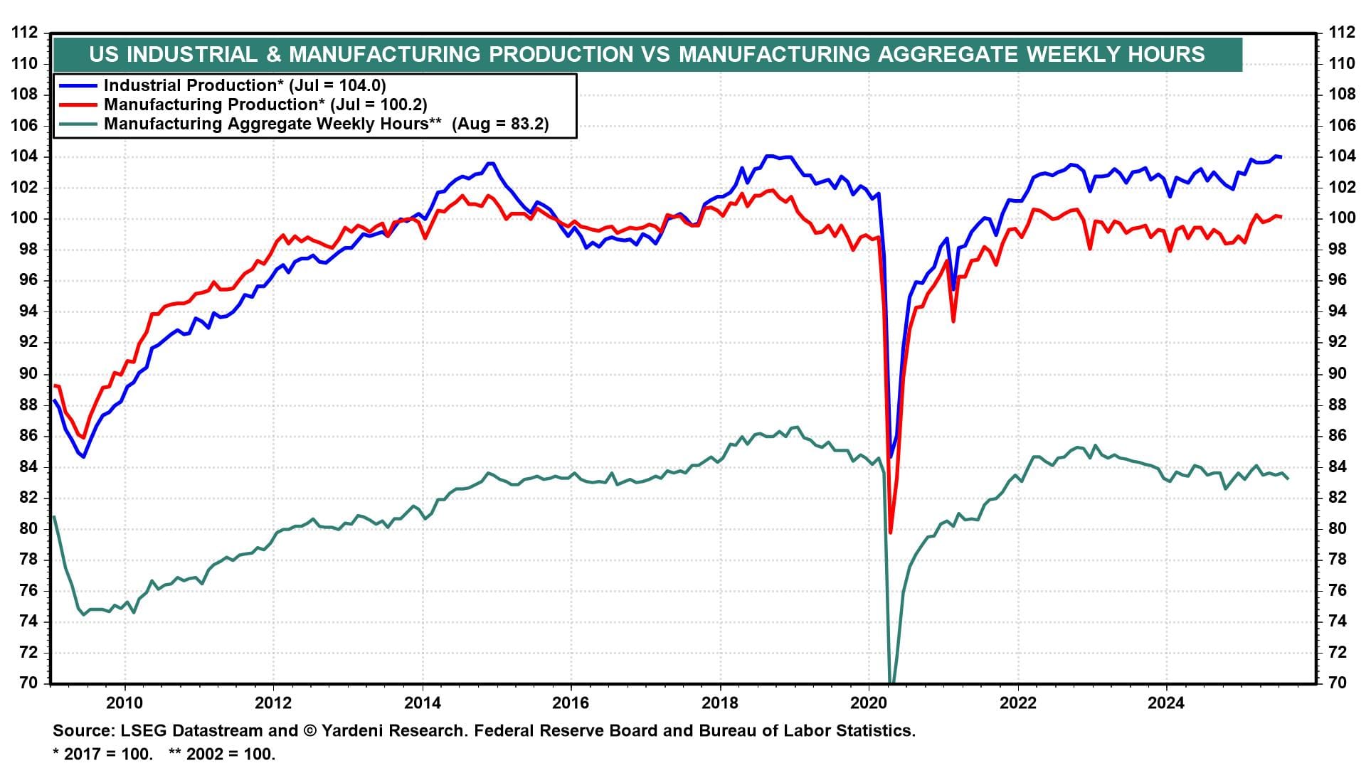(2) Industrial production. August industrial production (Tue) likely remained lackluster given weaker manufacturing hours worked and the 48.7 reading of the ISM manufacturing index last month (chart).