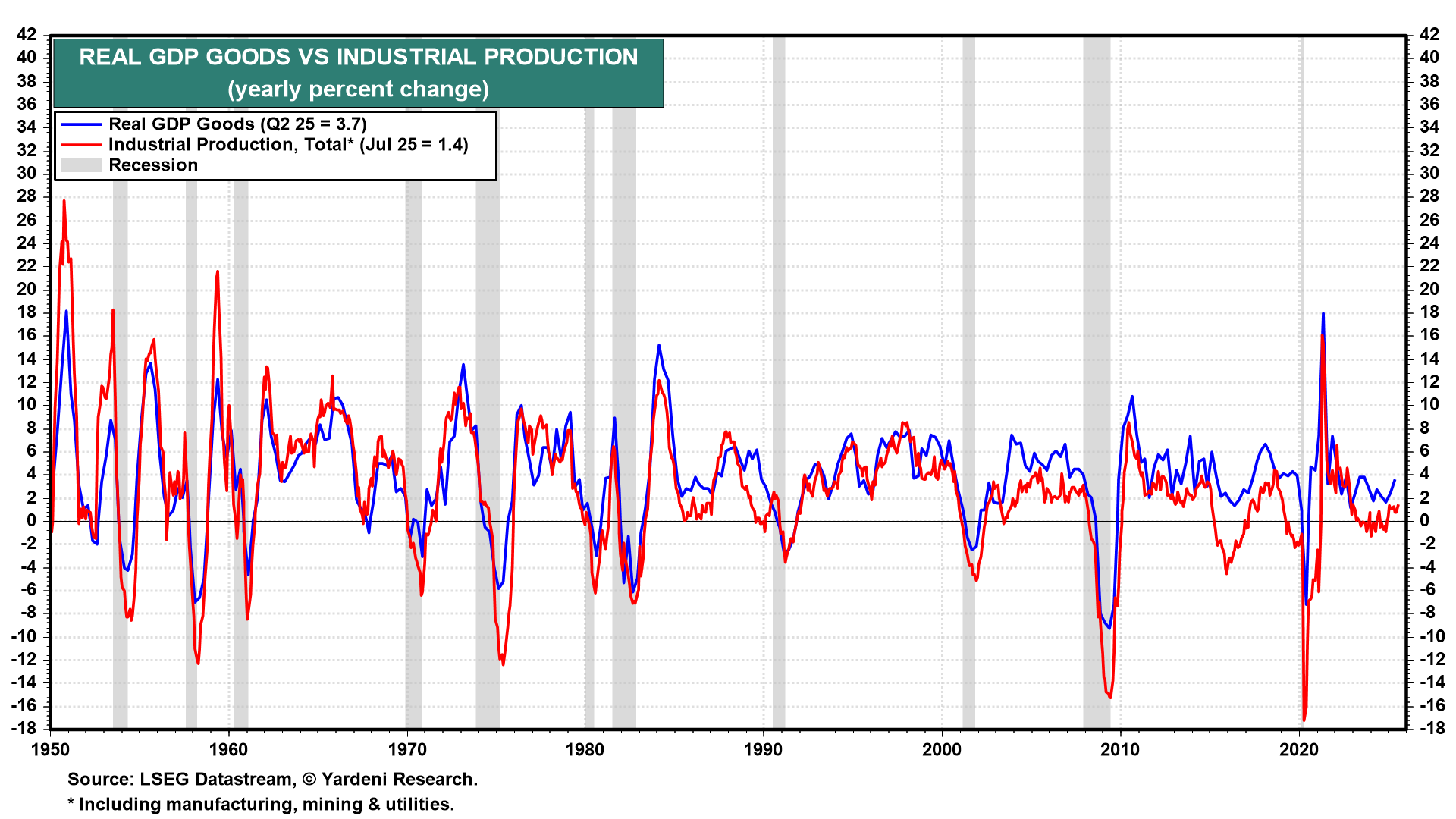 However, since 2001, the y/y growth rate in industrial production has been consistently weaker than the growth rate of real GDP goods (chart).