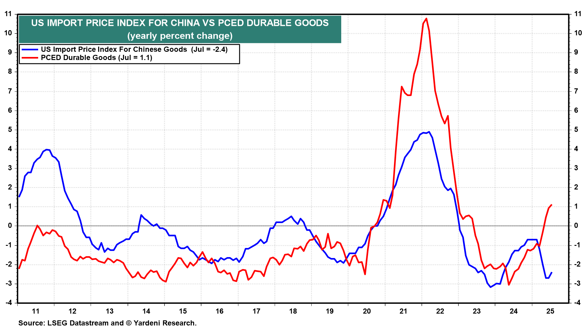 (3) Import prices. Import prices (Tue), especially those from China, have had a deflationary impact on consumer durable goods prices in recent years, until both rose sharply during the 2022-23 inflation spike (chart). Now, Chinese exporters to the US are cutting their prices in an effort to offset tariff-fueled price increases in US consumer durable goods.
