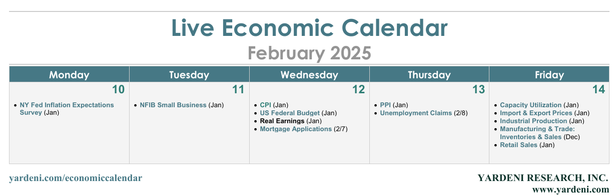 The focus of the economic week ahead will be inflation. Businesses tend to raise prices at the beginning of the year; that could result in January CPI and PPI releases (Wed and Thu) that are hotter than expected even though both are seasonally adjusted. A few Fed officials recently worried out loud that tariffs could interrupt the progress toward the Fed's 2.0% inflation target. We expect Trump 2.0 will generate more noise than signal in the upcoming inflation news, as the economy is buffeted by four “D”s: deregulation, deportations, duties, and de-bureaucratization.