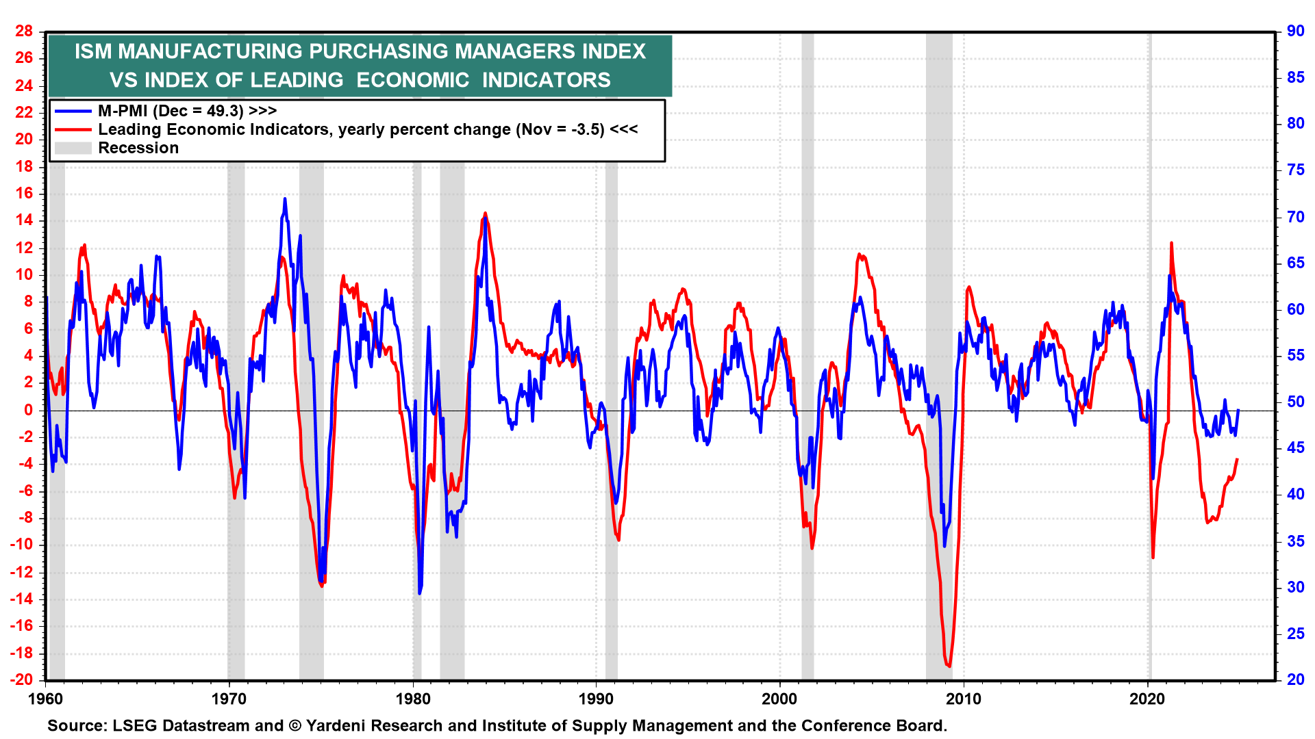 (2) Composite cyclical indicators. The index of Coincident Economic Indicators (Tue) likely rose to another record high in December. The index of Leading Economic Indicators (LEI) has misleadingly predicted a recession since late 2021. The LEI is a better indicator of manufacturing production than overall real GDP (chart).