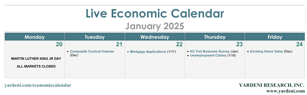 The week ahead will be light on economic indicators and heavy on executive orders (EOs). While the markets are closed on Monday for MLK Day, President Donald Trump will be inaugurated into office for his second term. Out of the gate, Trump 2.0 is likely to target tariff, immigration, regulatory, energy, and cultural issues with a deluge of EOs.