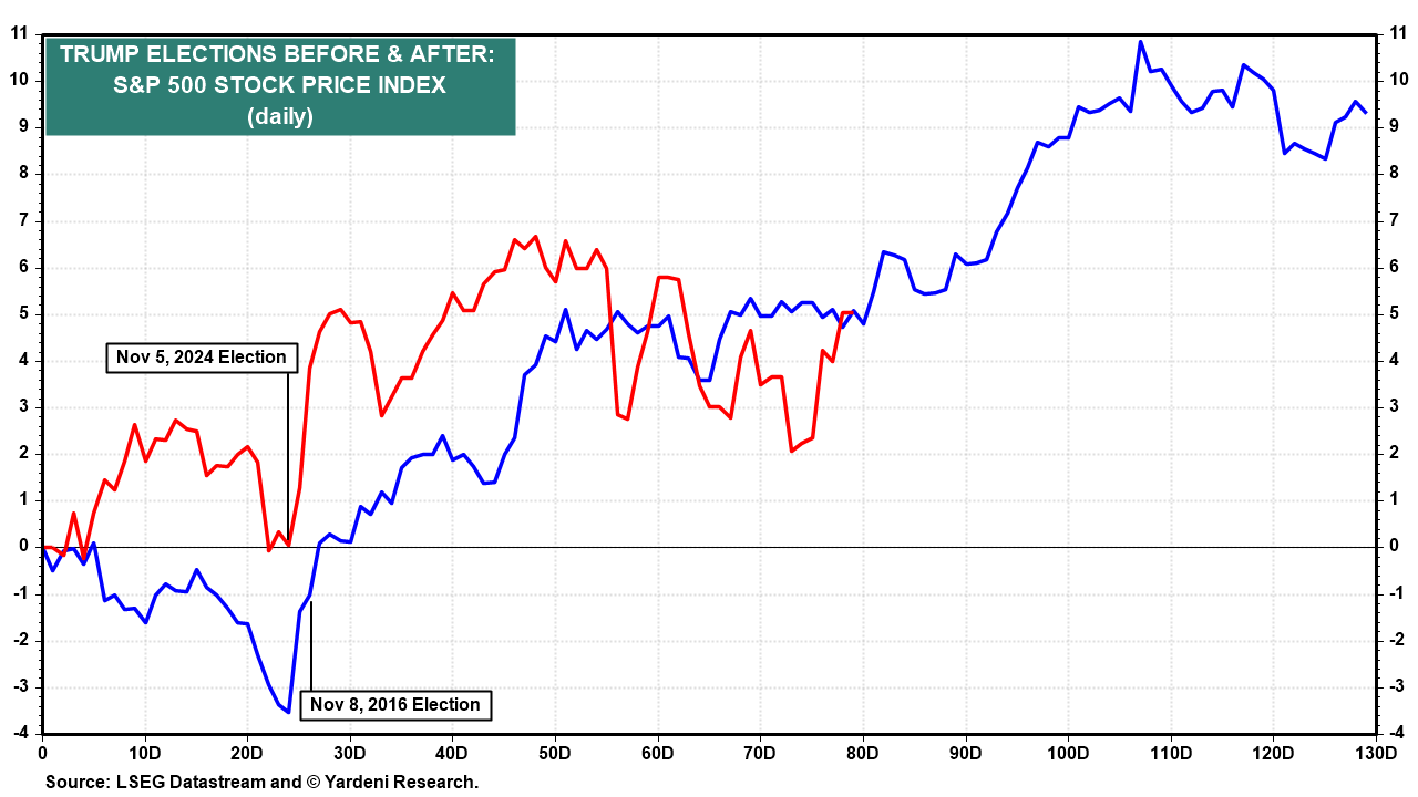Stock prices rallied during the first 100 days of Trump 1.0 and should do so again during the first 100 days of Trump 2.0 (chart). Anything is possible this week. Maybe Meta will buy TikTok? Who knows?