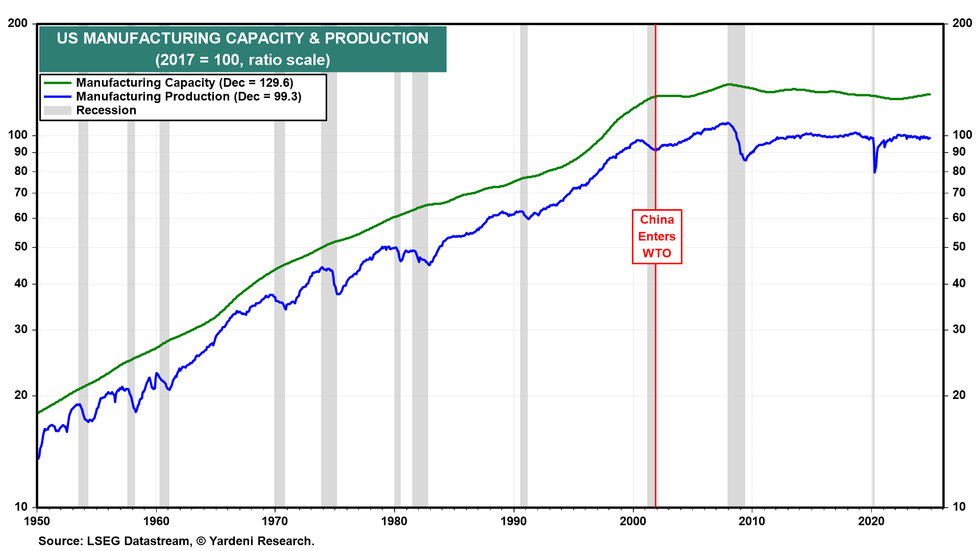 (1) Tariffs. The costs of higher tariffs include potentially higher prices for American consumers. If the dollar strengthens on higher tariffs, as we expect, then foreign exporters might pay the price in lower revenues in their local currency. If tariffs lead to expanded capacity in the US, that could be disinflationary. US industrial production and capacity have been flat since China entered the World Trade Organization and took advantage of its liberal trading system (chart).