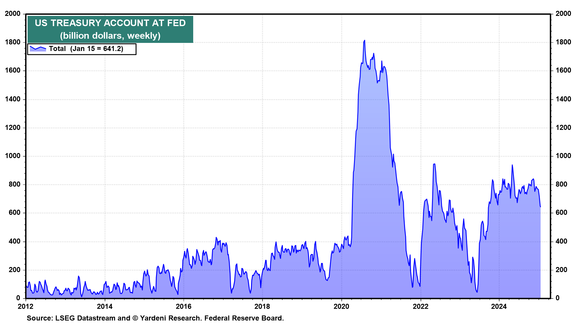(3) Debt ceiling. Without a congressional debt-ceiling deal, incoming US Treasury Secretary Scott Bessent will have to spend down the $641 billion in the Treasury General Account to fund the government (chart). However, with the GOP in full control of DC, Congress should be able to raise or abolish the debt ceiling in short order.