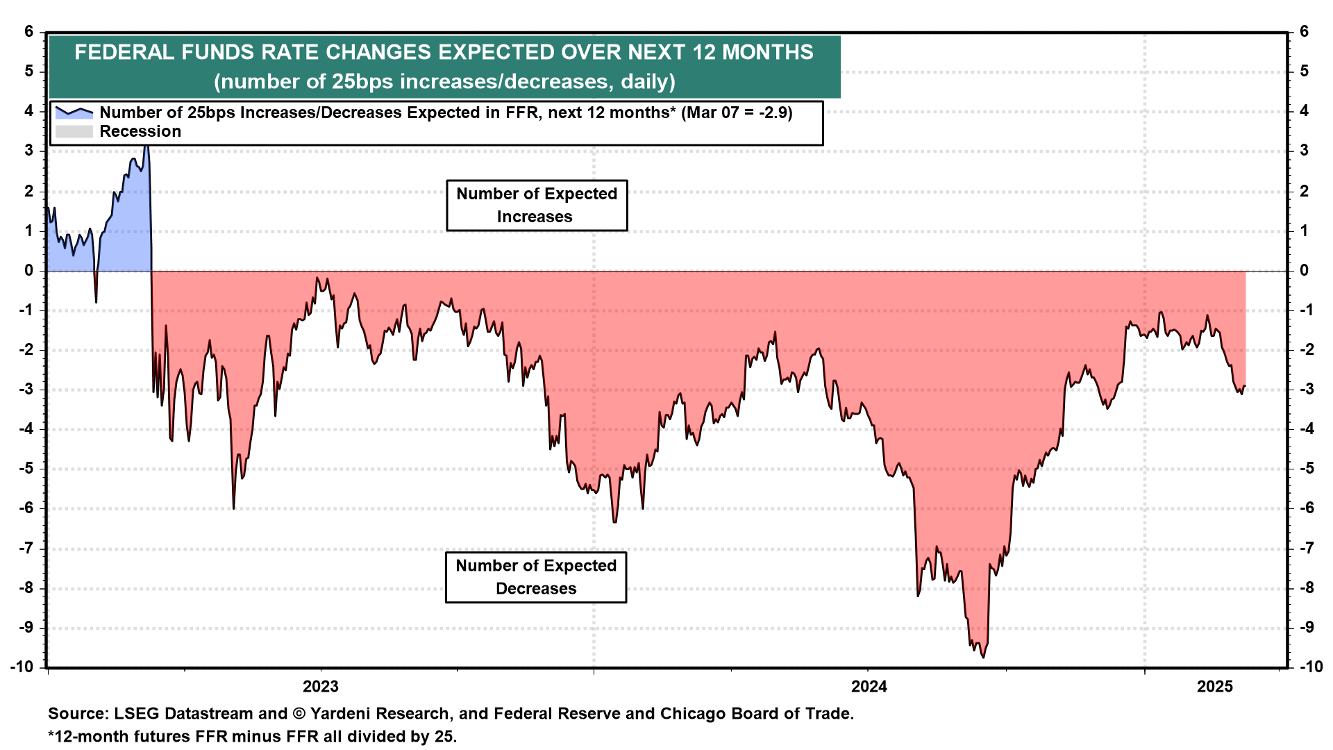 If CPI services inflation remains sticky at January's rate of 4.2%, then reviving goods inflation could raise overall inflation in coming months. While the market expects three Fed rate cuts this year, we continue to believe inflationary pressures will keep the Fed on pause for the remainder of the year (chart). We also expect the economy to remain more resilient than widely expected currently, though we did raise our odds of a recession from 20% to 35% last week.