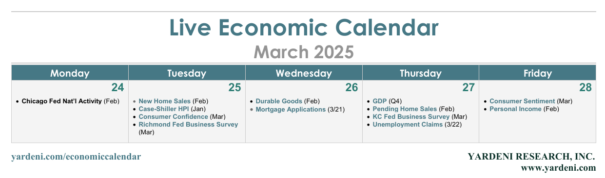 The predominant theme of the economic week ahead will be inflation, both realized and expected. Consumer inflation expectations will be updated for March, while February's PCED inflation rate also will be released (both Fri). Cooler-than-expected CPI and PPI prints last month aren't likely to translate to the PCED due to some hotter components that feed through to the Federal Reserve's preferred inflation gauge. Regardless, February's inflation data are relatively stale. We think consumer expectations and any new tariff news ahead of the April 2 "Liberation Day," when President Trump will impose reciprocal tariffs around the world, are more likely to move the markets.