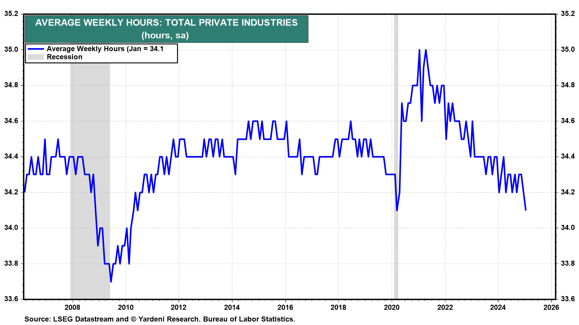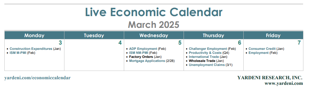 (2) Employment. January's labor market indicators were almost certainly weakened by January's Arctic blast, which brought record-breaking low temperatures and fueled a winter storm that dropped historic snowfall for parts of the South. Payroll employment rose only 143,000, and the average workweek fell (chart). Both should show rebounds in February's employment report (Fri). We are expecting that federal job loses attributable to the DOGE Boys won't show up until the March employment report. But they did start to show up in initial unemployment claims during the February 21 week.